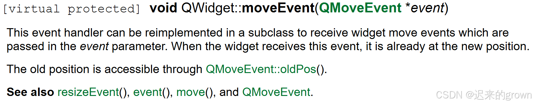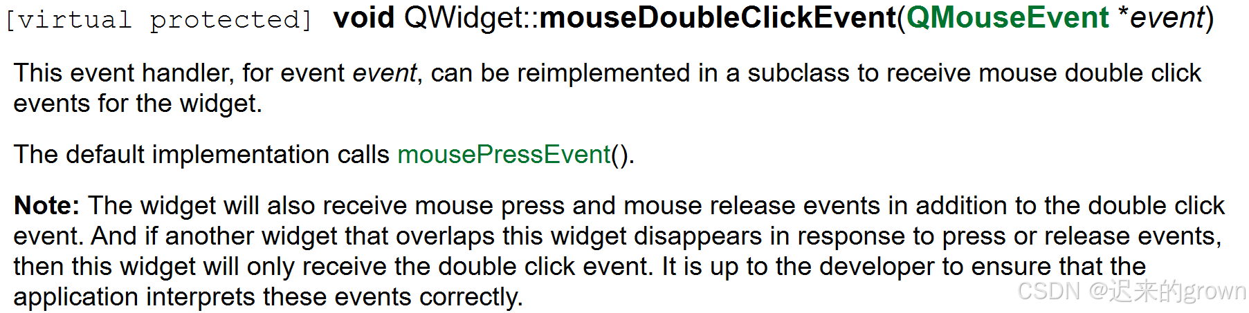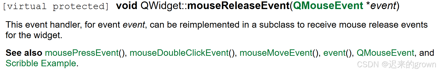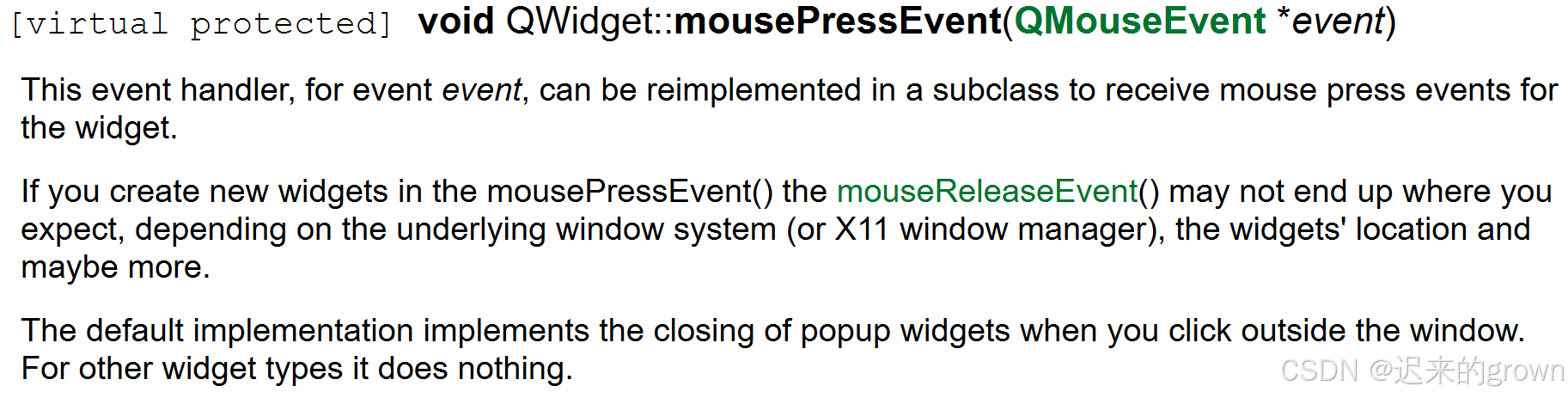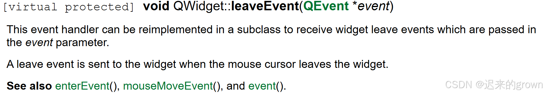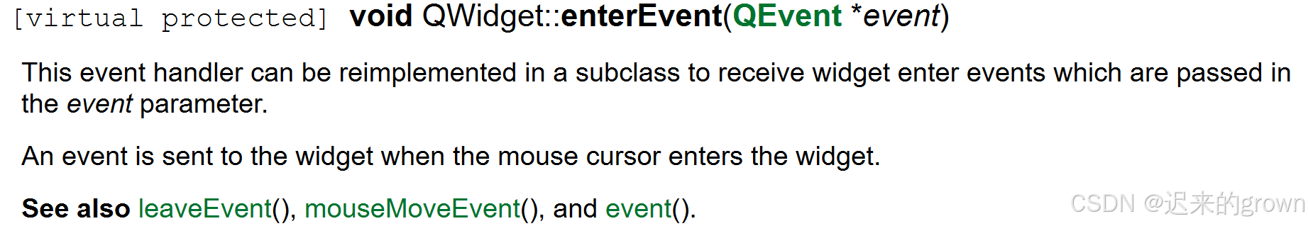 例如:enterEvent(QEvent* event)表示鼠标进入事件,当鼠标进入对应控件时自动调用。