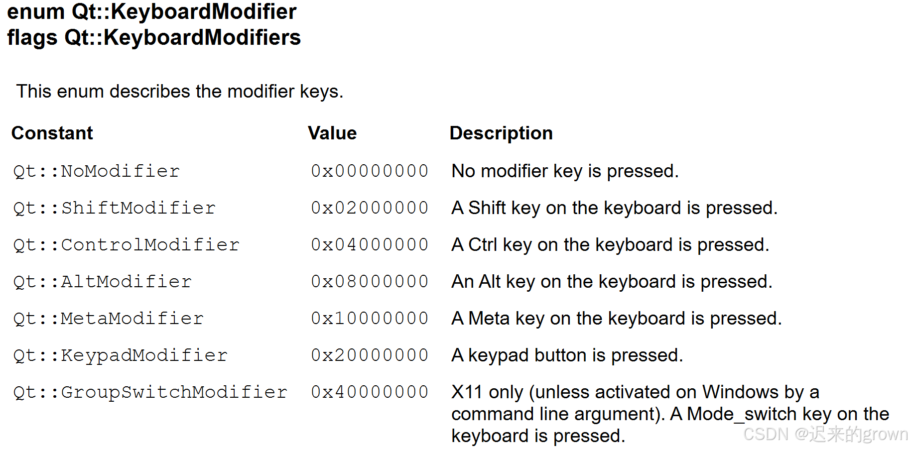 Qt::KeyboardModifier中定义了处理键盘事件时对应的修改键。
