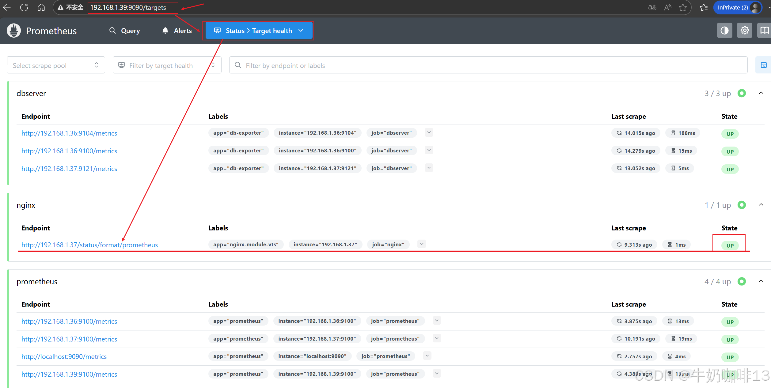 #然后打开浏览器进入Prometheus Server的Web界面【IP:9090】查看【Status-->Target health】即可看到添加的nginx节点及其状态【up】表示在线【down】表示离线。