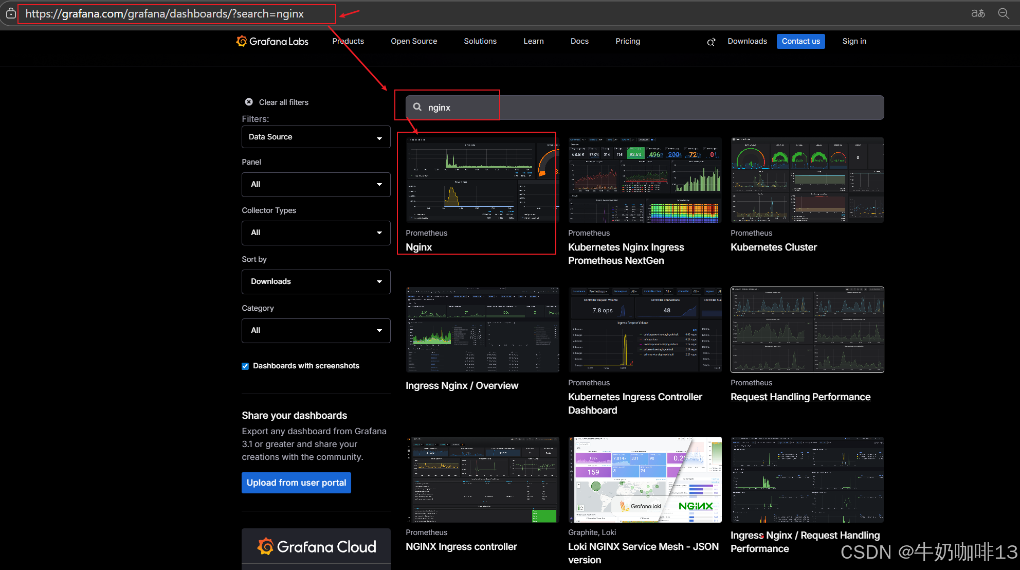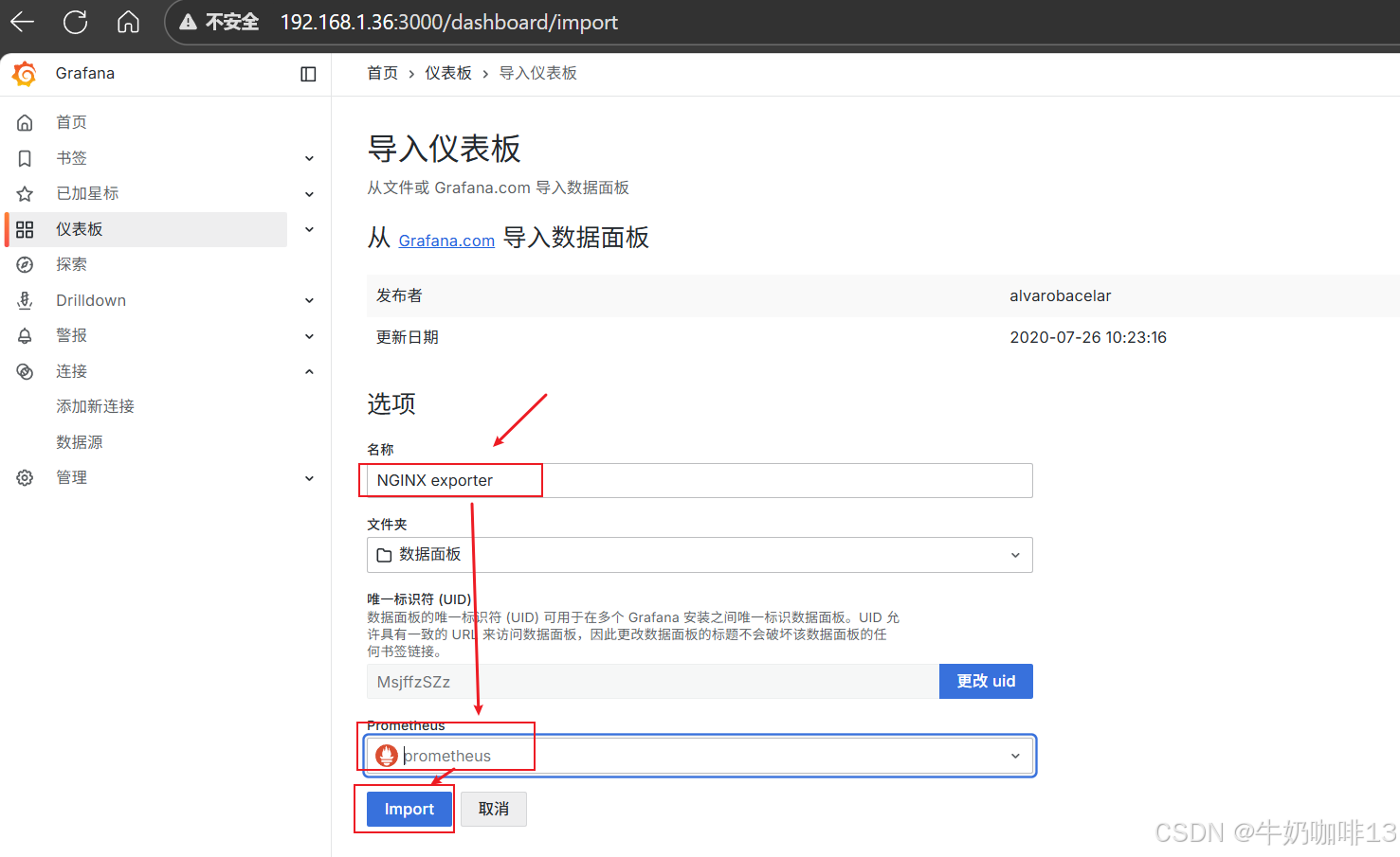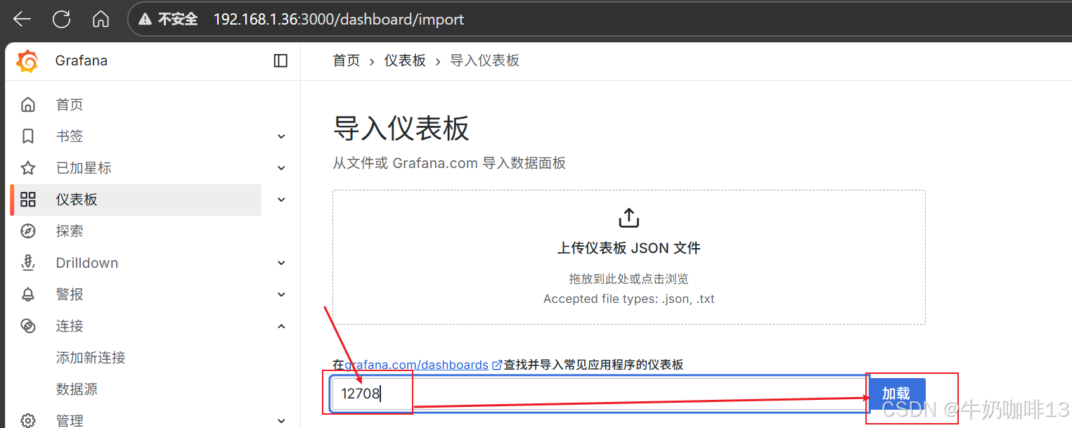 然后配置仪表盘(到【Grafana dashboards | Grafana Labs】官网获取更多的仪表盘模板。在Grafana的仪表盘界面中间输入框输入nginx即可列出所有nginx相关模板(如:我们选择【Nginx】模板进入后,获取到该模板的编号是【14900】【12708】)然后在浏览器上进入我们服务器上部署好的Grafana界面的【仪表盘】-->【新建】-->【导入】界面输入模板的编号或者JSON文件内容后点击【加载】后弹出的界面上可以修改模板名称、数据源为prometheus后点击【Import】)如下图所示:
