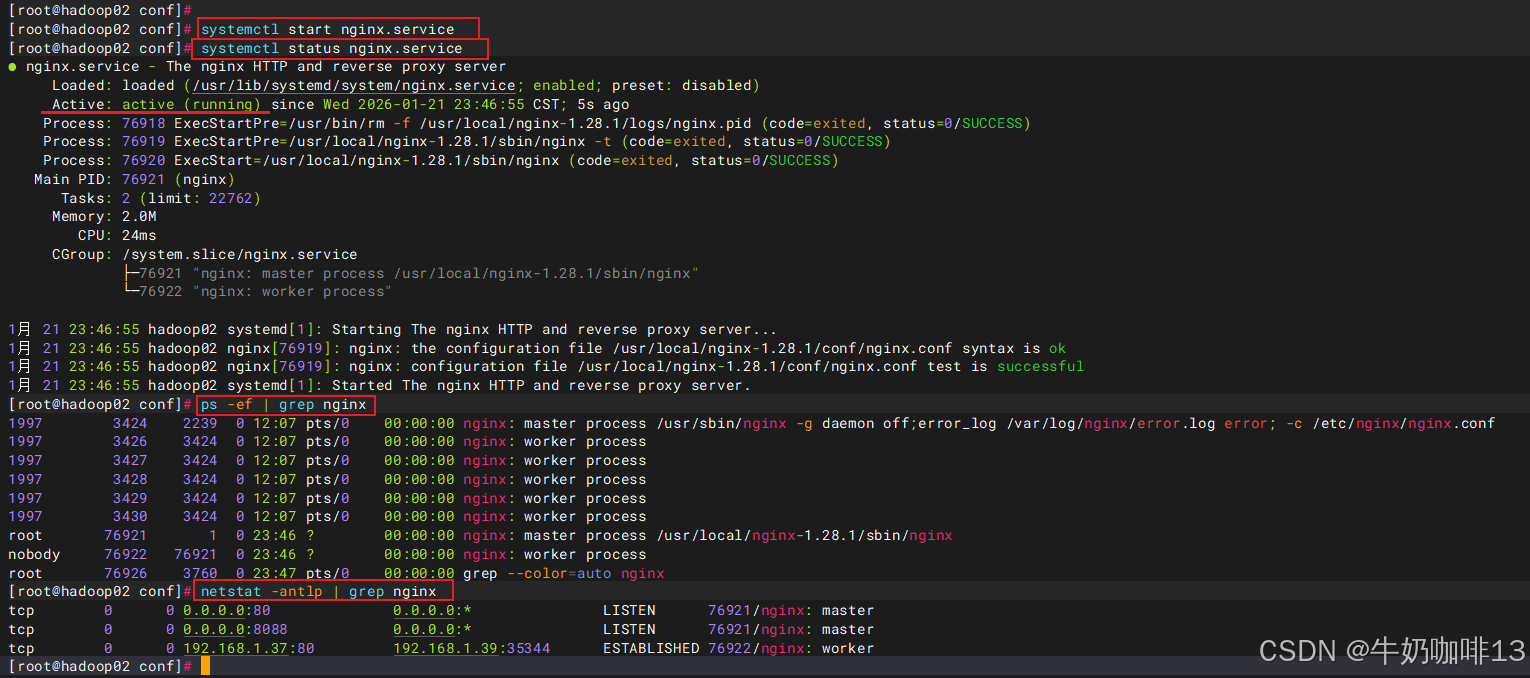 #启动nginx服务让配置生效并查看进程与端口信息