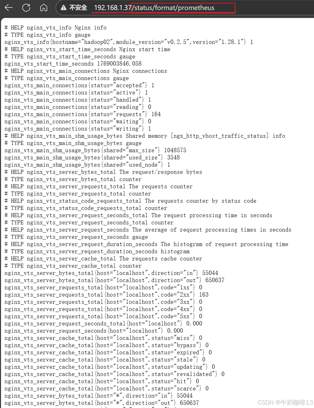 由于最新版的【nginx-module-vts】模块已经新增了【/status/format/prometheus】接口,可直接返回 Prometheus 的格式,因此只用给Nginx添加上【nginx-module-vts】模块即可。