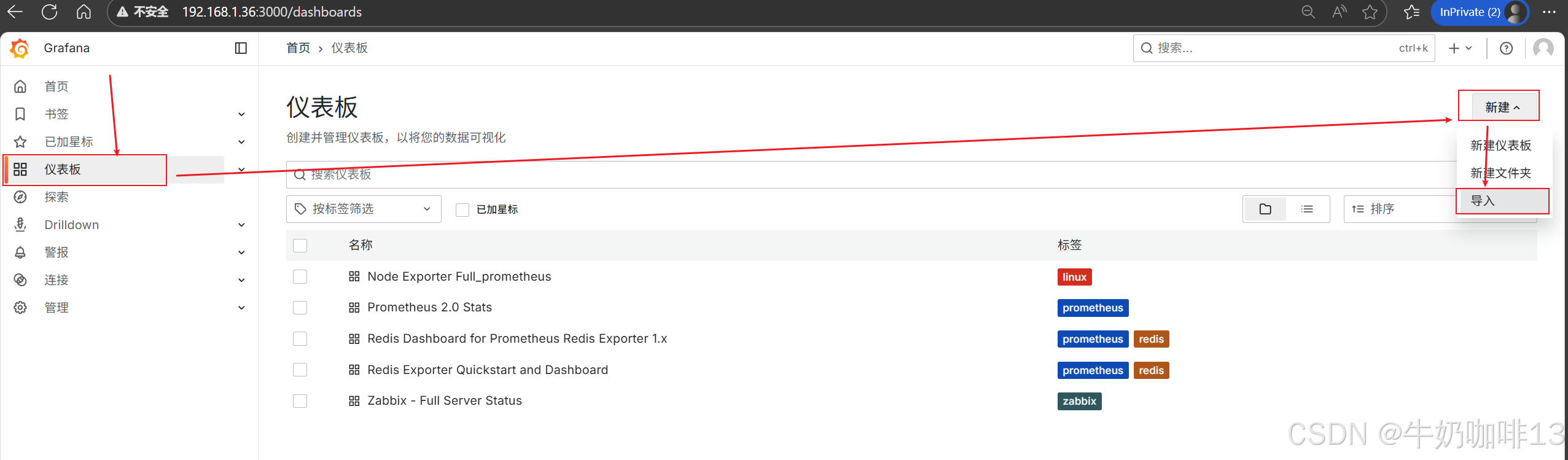 (若已经添加过数据源了则不用重复这个操作)登录到Grafana中(IP:3000)选择【连接】-->【添加新连接】-->【搜索Prometheus】后点击Prometheus-->点击右上角的【添加新数据源】则进入设置界面,在设置界面可以填写名称、与prometheus server的URL地址后点击最底部的【保存并测试】。