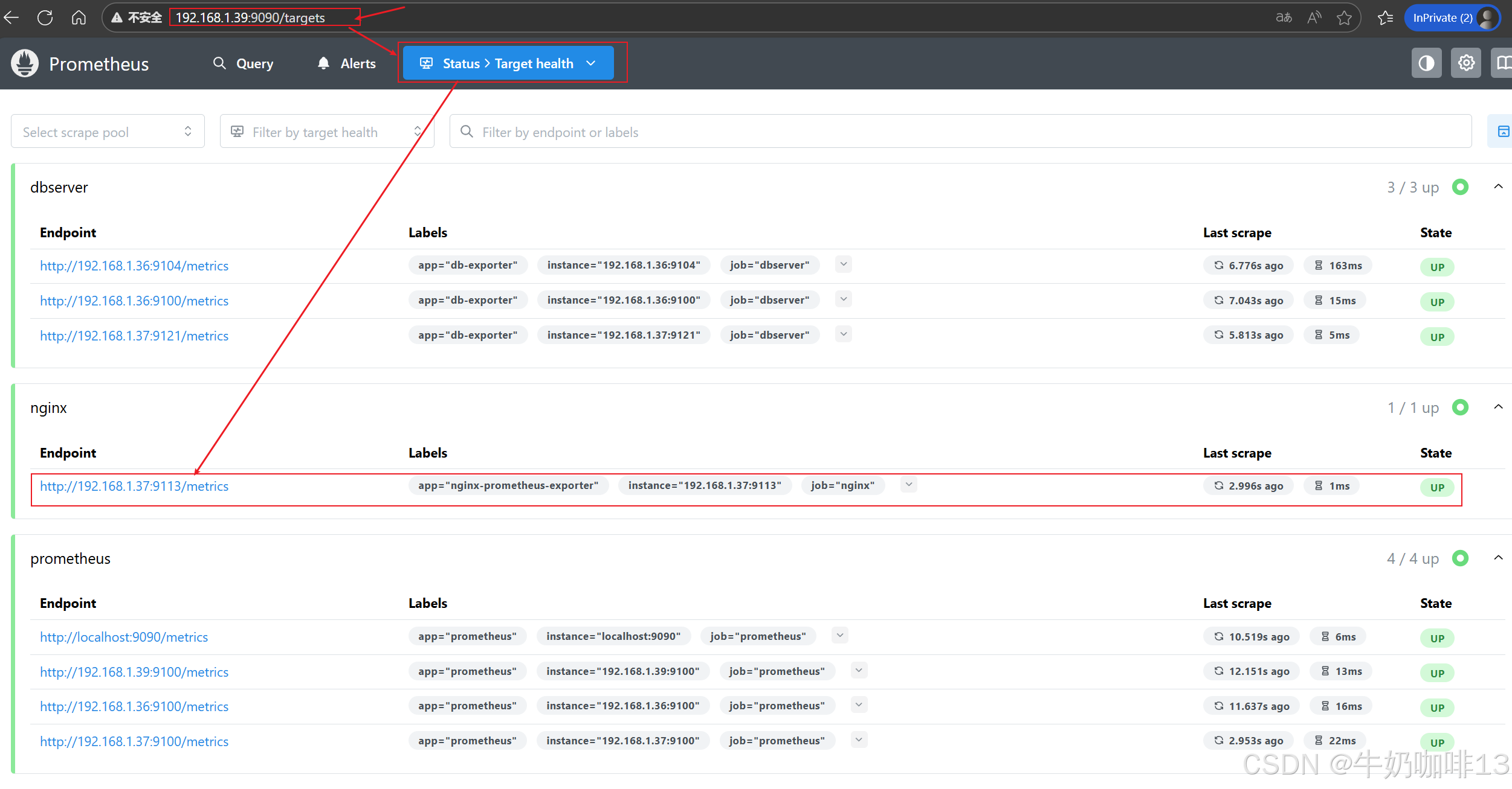 #然后打开浏览器进入Prometheus Server的Web界面【IP:9090】查看【Status-->Target health】即可看到添加的nginx-prometheus-exporter节点及其状态【up】表示在线【down】表示离线。