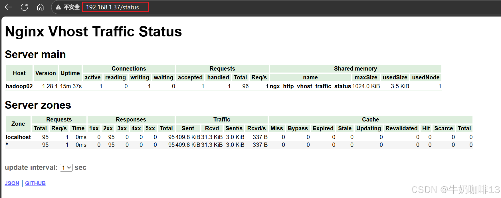 《2》【Nginx VTS exporter】,这种方式比第一种要强大的多,安装方式更简单,支持的指标也更丰富,它依赖于【nginx-module-vts】模块,vts模块可以提供大量的 Nginx 指标数据,可以通过 JSON、HTML 等形式查看这些指标。【Nginx VTS exporter】 就是通过抓取【/status/format/json】接口来将 vts 的数据格式转换为 Prometheus 的格式。不过,在【nginx-module-vts 】最新的版本中增加了一个新接口:/status/format/prometheus,这个接口可以直接返回 Prometheus 的格式,从这点这也能看出 Prometheus的影响力,目前Nginx VTS exporter基本退役了,所以我们只需安装此模块即可。无需安装基于nginx的exporter。