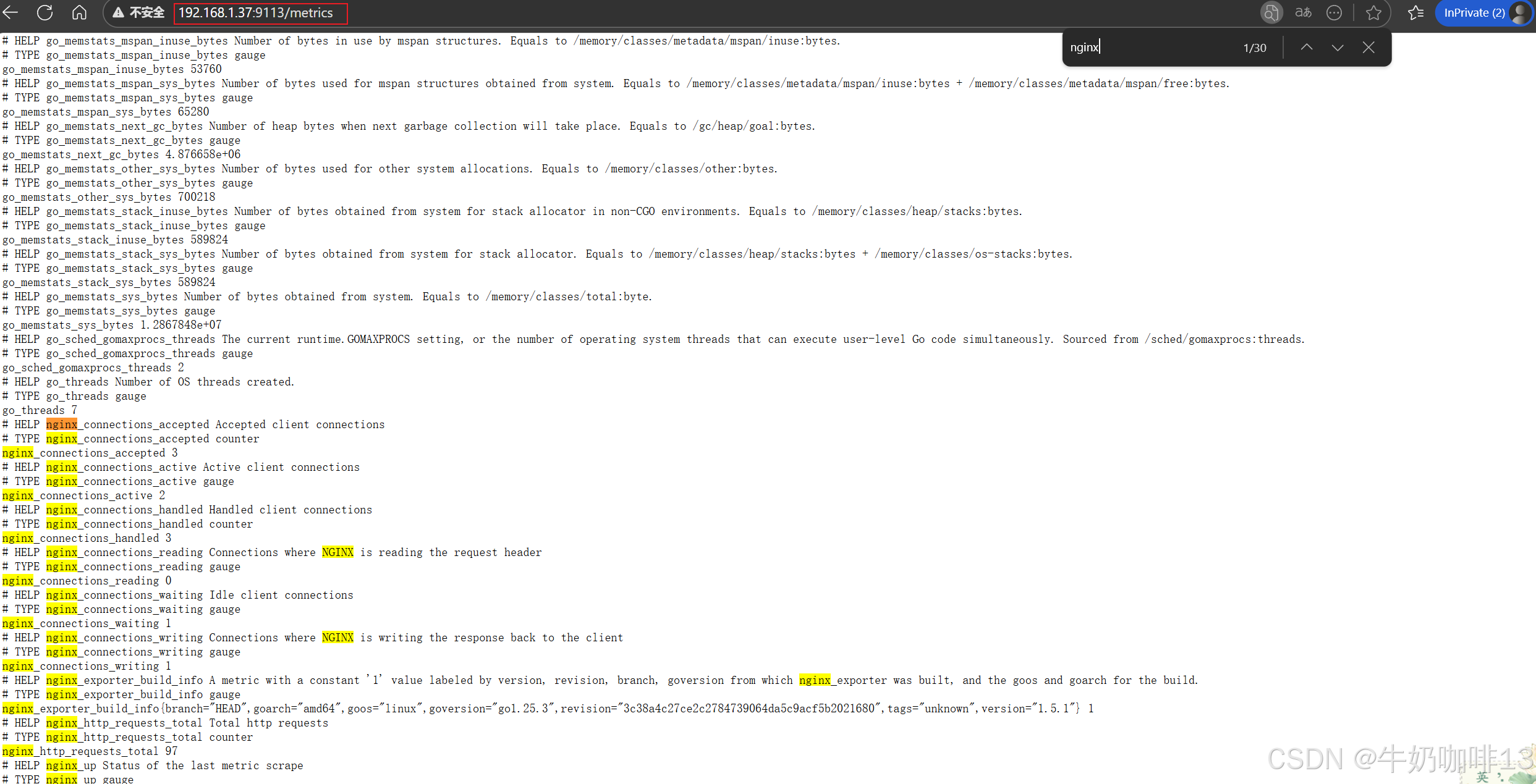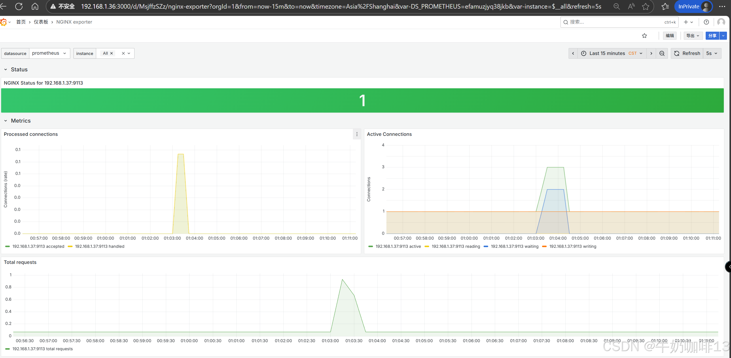 #最后通过【本机IP:9113】在浏览器即可访问到nginx_prometheus_exporter收集到的nginx状态数据。