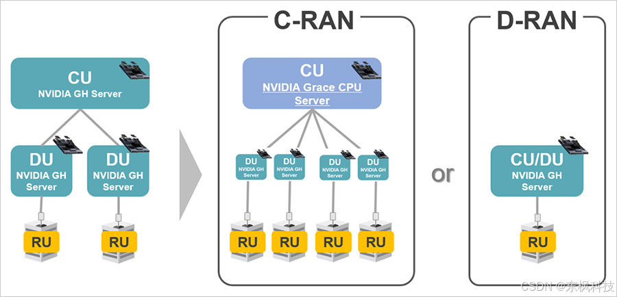另一种是 D-RAN,在同一台服务器上同时处理 CU 与 DU 功能,从而最大限度简化硬件配置。