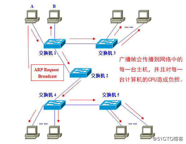 为什么需要分割广播域呢?那是因为,如果仅有一个广播域,有可能会影响到网络整体的传输性能。具体原因,请参看附图加深理解。