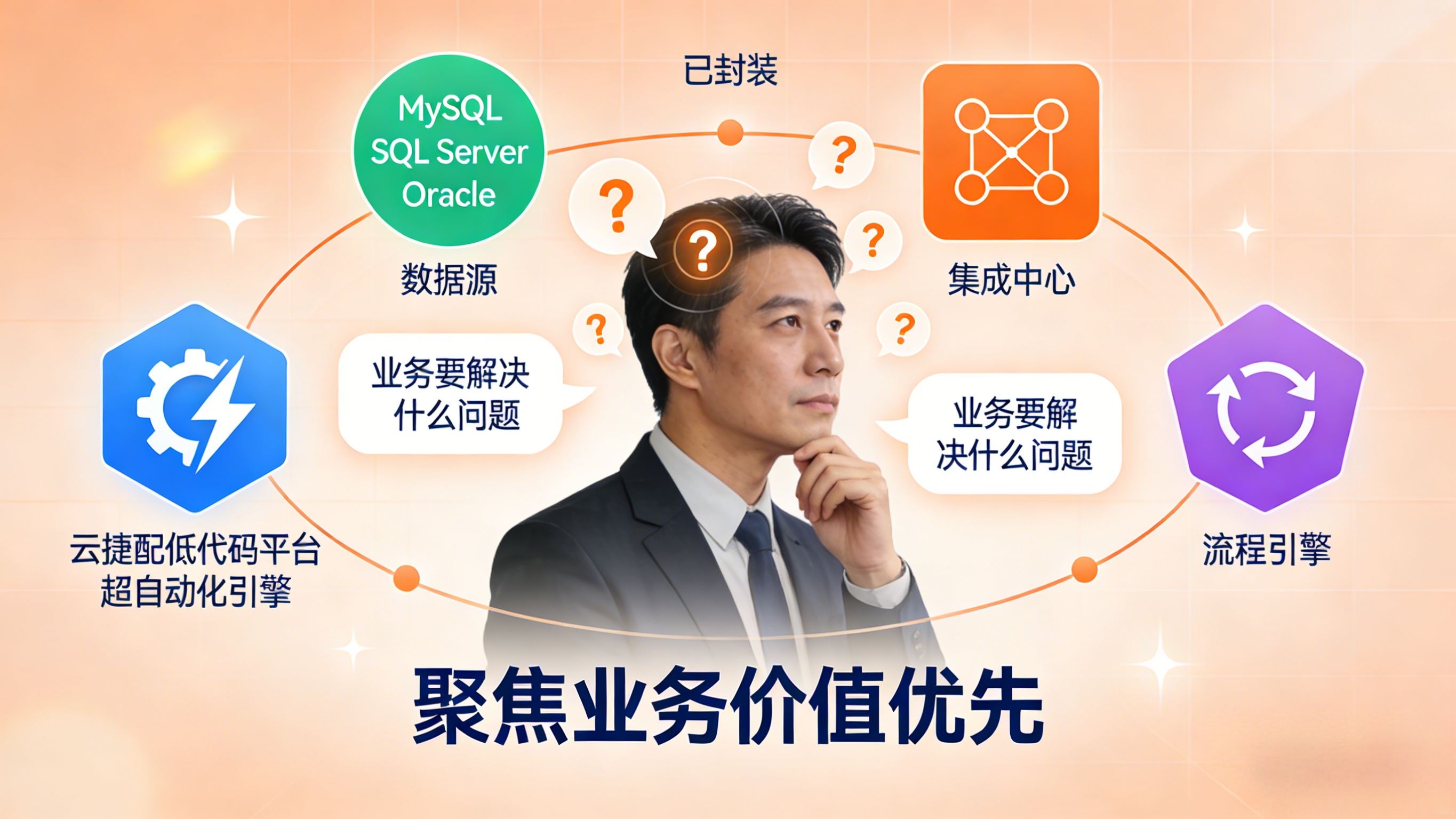 低代码平台通过内置技术能力,让需求分析回归业务本质。平台已封装主流技术架构、开源框架及集成能力,业务需求无需过度考虑技术实现细节。云捷配低代码平台的超自动化引擎、多数据源支持及完整API对接能力,可直接承接复杂业务需求------无需担心多系统集成难题,集成中心可轻松对接外部系统;无需纠结数据流转效率,平台支持MySQL、SQL Server、Oracle等多数据库联动,流程引擎可通过数据、时间、人员变动等事件触发自动化闭环。这种技术能力的前置封装,让需求分析更聚焦"业务要解决什么问题",而非"技术能实现什么功能",真正实现业务价值优先。