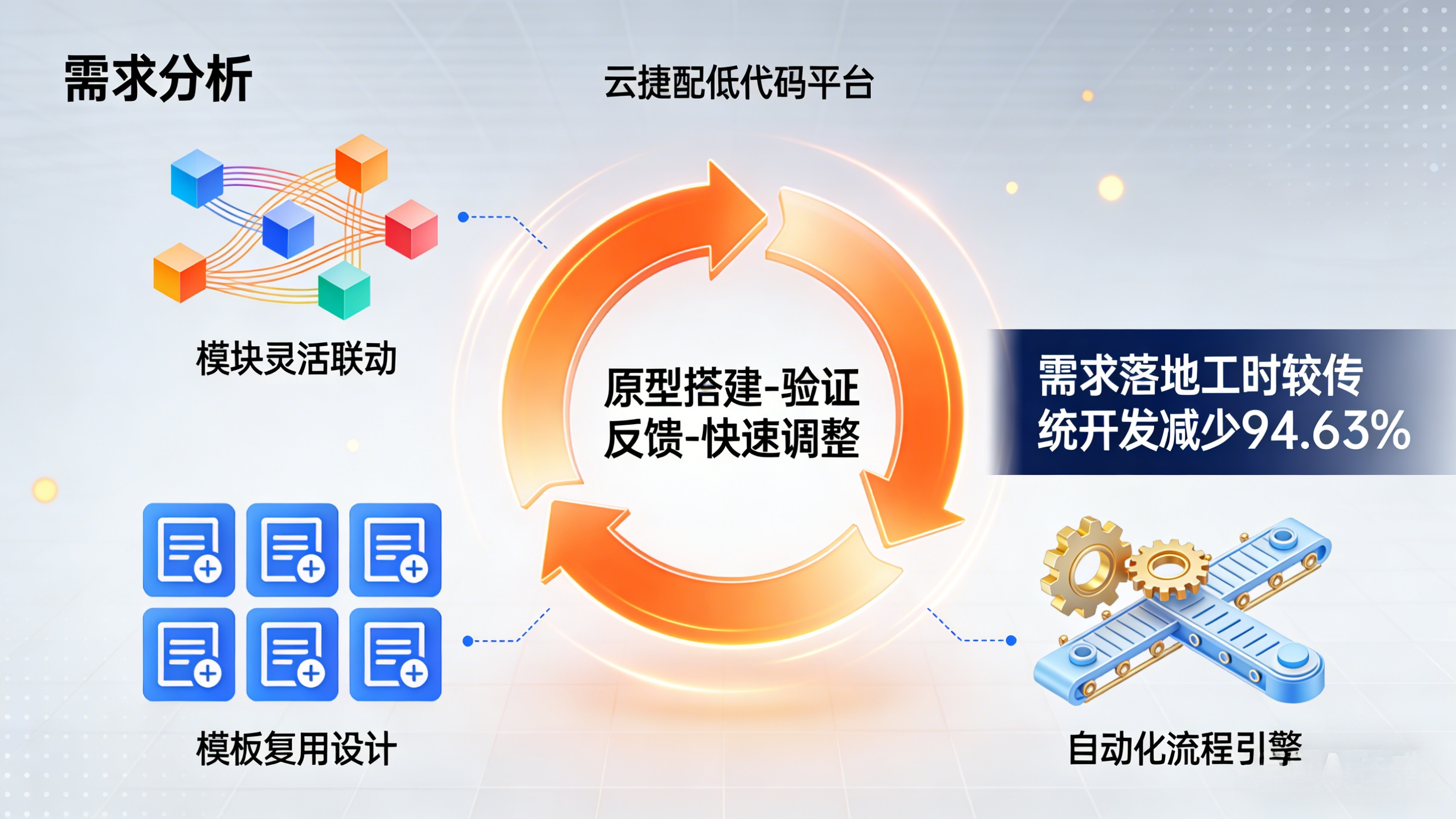 低代码平台以"敏捷迭代"为核心逻辑,重塑了需求分析的节奏。由于可视化搭建无需大量编码,需求可通过"原型搭建-验证反馈-快速调整"的循环逐步优化,无需在初期追求绝对完整。云捷配低代码平台的模块灵活联动、模板复用能力,进一步降低了迭代成本------业务人员可基于预置行业模板搭建初始版本,通过用户反馈快速调整表单字段、流程节点;平台的自动化流程引擎支持事件触发、API调用等灵活配置,可随业务规则变化实时优化工作流。这种渐进式需求分析模式,更适配当前企业业务快速变化的场景,某实验数据显示,低代码开发的需求落地工时较传统开发减少94.63%,迭代效率显著提升。