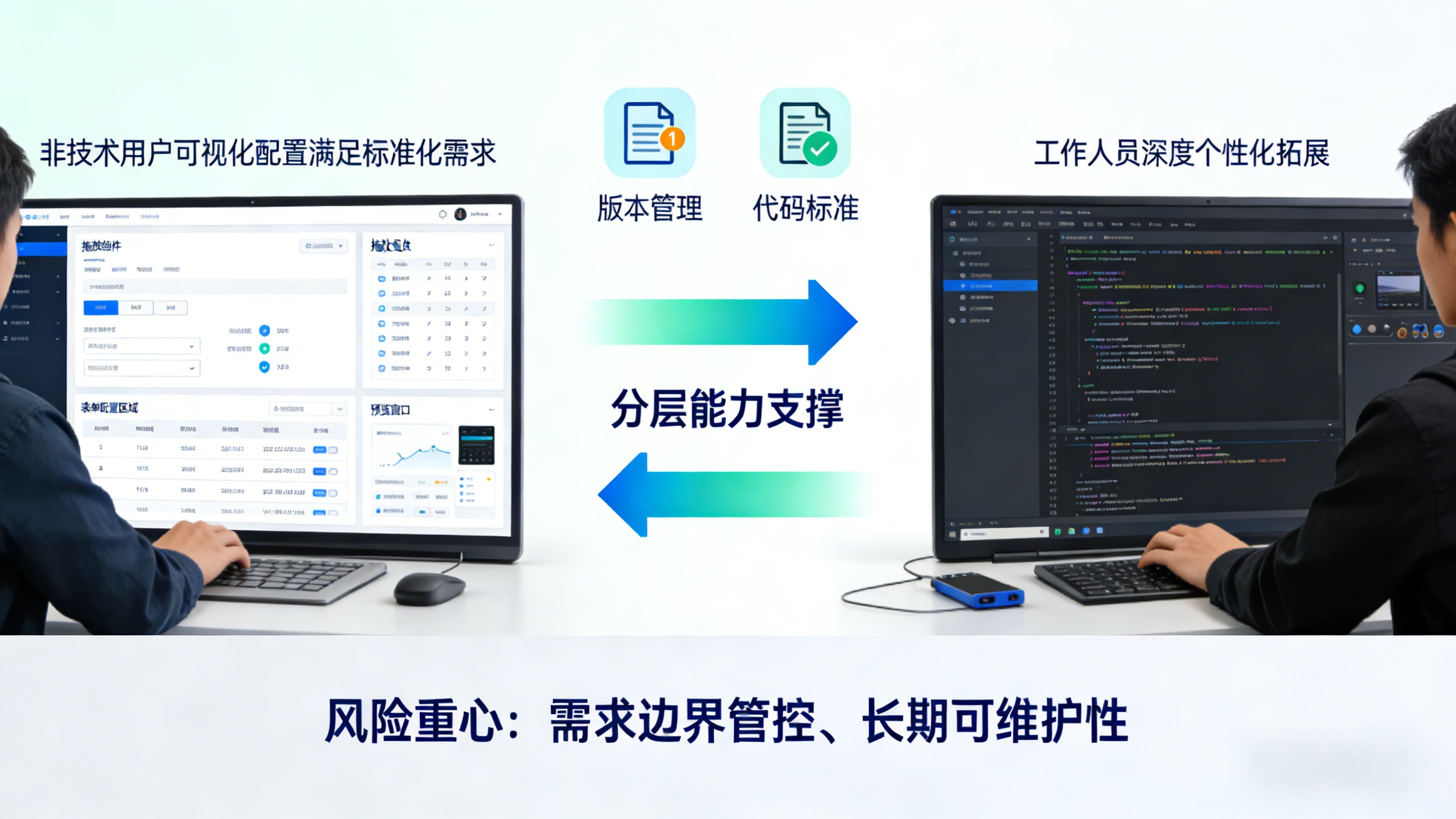 低代码需求分析的风险重心则转向"需求边界管控"与"长期可维护性"。由于搭建门槛低,易出现需求蔓延、个性化定制过度等问题,导致系统冗余、维护成本上升。对此,云捷配低代码平台通过"分层能力支撑"平衡灵活性与可控性:非技术用户通过可视化配置满足标准化需求,避免无序定制;技术人员可通过代码拓展实现深度个性化,同时借助平台优秀的代码标准与版本管理能力,保障系统可维护性。此外,平台支持本地化部署,可满足企业数据安全与合规需求,让需求分析过程中无需过度担忧数据主权风险,进一步聚焦业务本身。