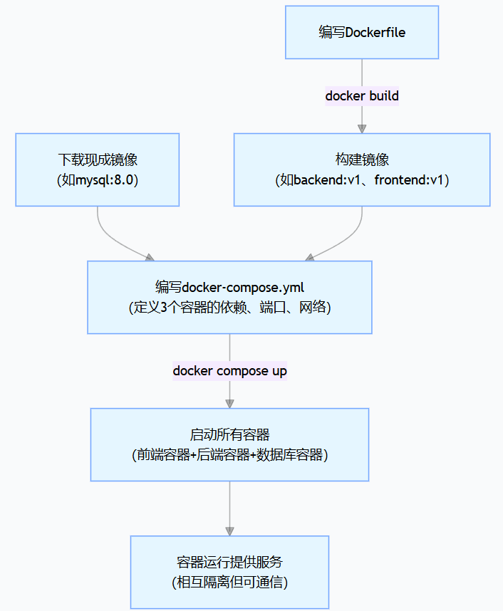 - 协作关系:Dockerfile → 构建镜像 → Docker Compose 基于镜像启动容器(或直接用现成镜像)→ 容器运行提供服务;