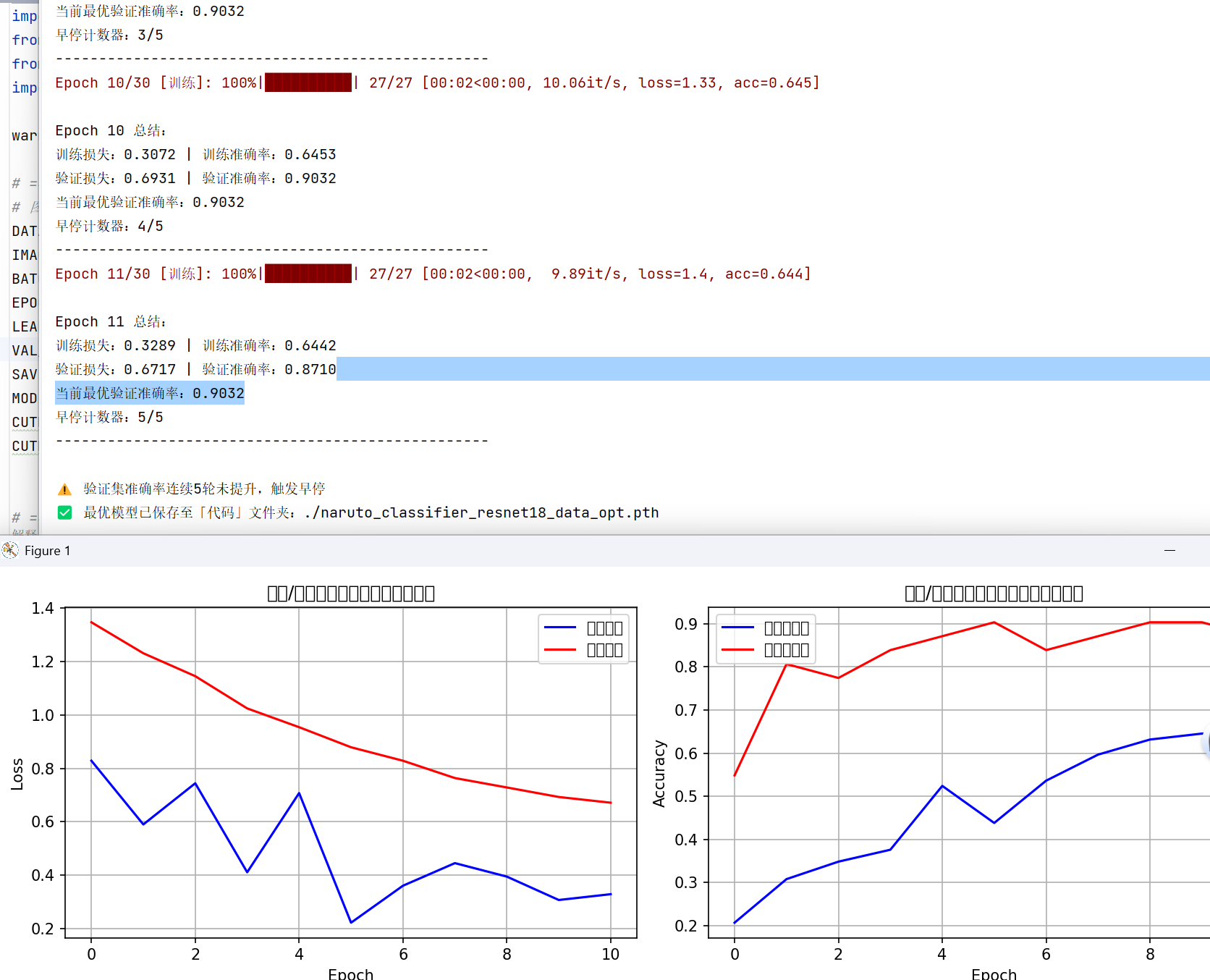 "我已手动筛选完图片,数据集按类别分文件夹存储(路径:D:\无畏时刻\机器学习\vibe coding火影人物分类\人物分类)。作为擅长神经网络的专家,用PyTorch+ResNet18迁移学习实现分类模型,要求:1. 自动划分训练集/验证集(比例2:8);2. 包含数据增强、早停逻辑,缓解过拟合;3. 训练完成后可视化损失和准确率曲线;4. 保留之前的循环预测逻辑,输入q退出。不使用混淆矩阵分析,代码可直接运行。"