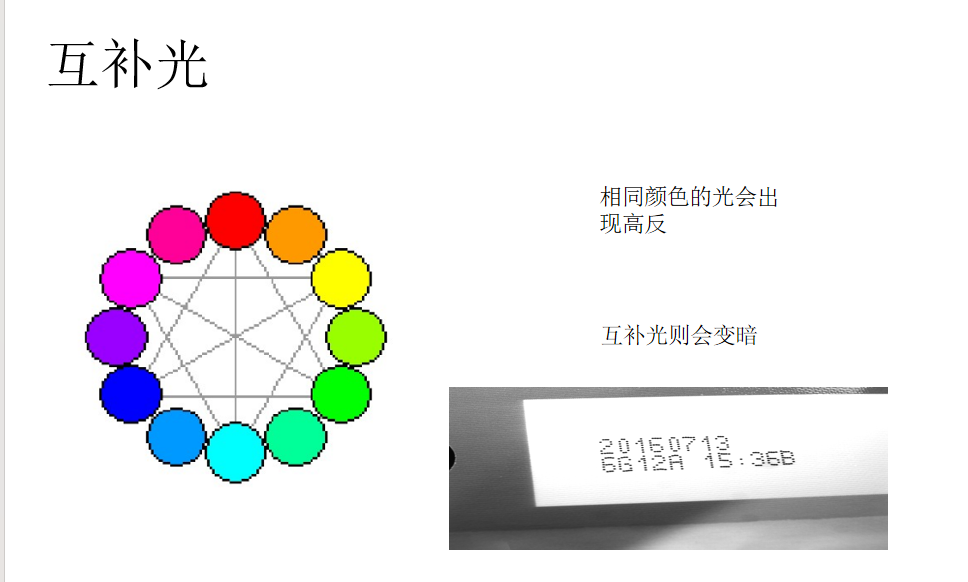 实际应用:检测红色包装袋上的黑色字符时,采用红光照射可使红色背景高反而字符保持低反,直接获得高对比度图像,避免后续复杂的图像增强处理。