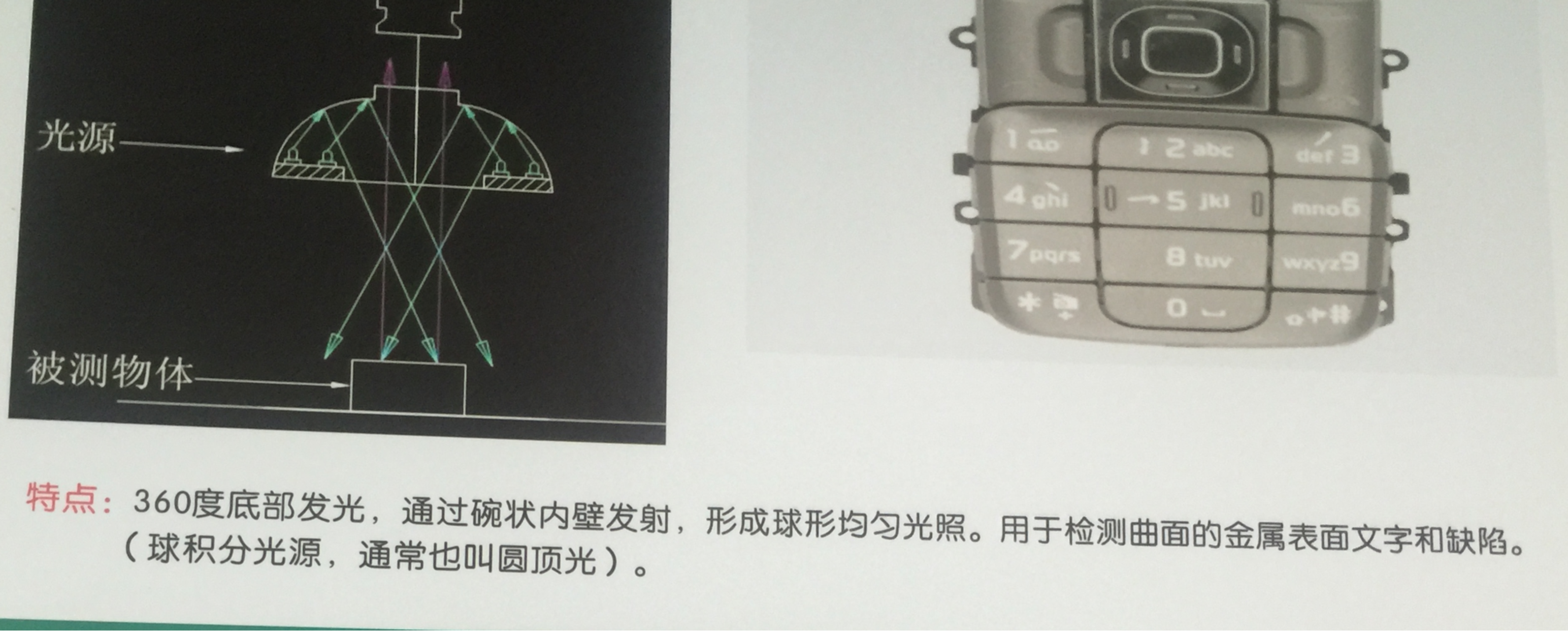 发光形式 :球形/半球形内腔,内壁为高反光漫射涂层,光源从内腔侧壁/底部发光,经多次漫反射后从顶部出光口均匀射出,工件置于出光口正下方。