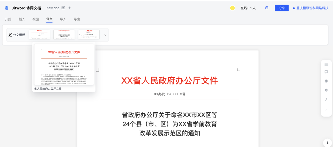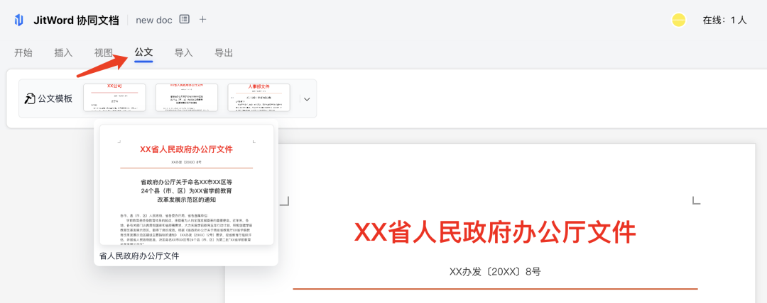 大家可以在 jitword 共建版中,点击公文tab栏,可以看到我们预置的公文模版,大家可以一键使用,并微调格式和内容,快速创建公文。