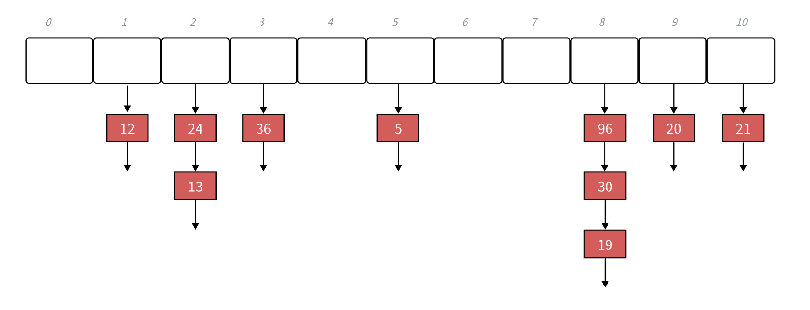 链地址法相当于省略了线性探测这一步,连地址法将所有余数相同的值都挂在同一个位置中, 像一个链表一样来了一个值就往后面挂。 这样的好处是不用再去占别人的位置了,查找的时候直接通过计算就能找到相应的位置,然后再遍历链表找出这个值即可,所以相比于开放定址法,链地址法做了一个很大的优化,效率也得到了非常大的提升。 这也是实际中为什么使用链地址法而不用开放定址法的原因!