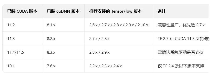 2.5 及以上pip install tensorflow==x.x.x 单包包含 CPU/GPU 支持,自动适配环境