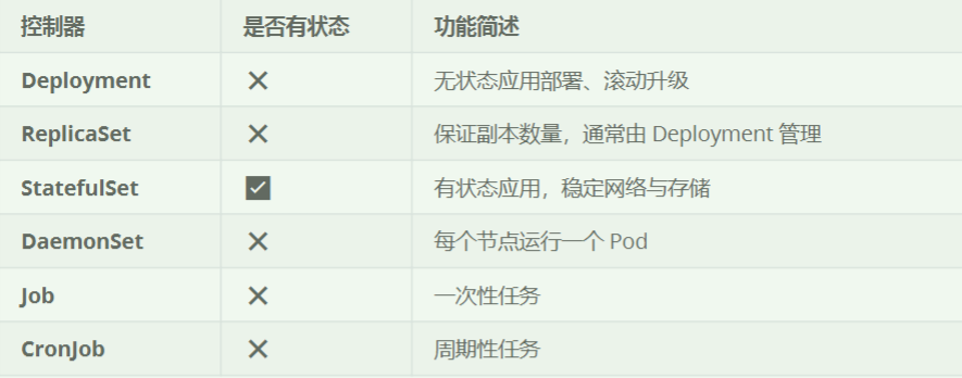 | StatefulSet | 管理有状态应用,提供稳定的网络标识与存储。 | 数据库、 Zookeeper |