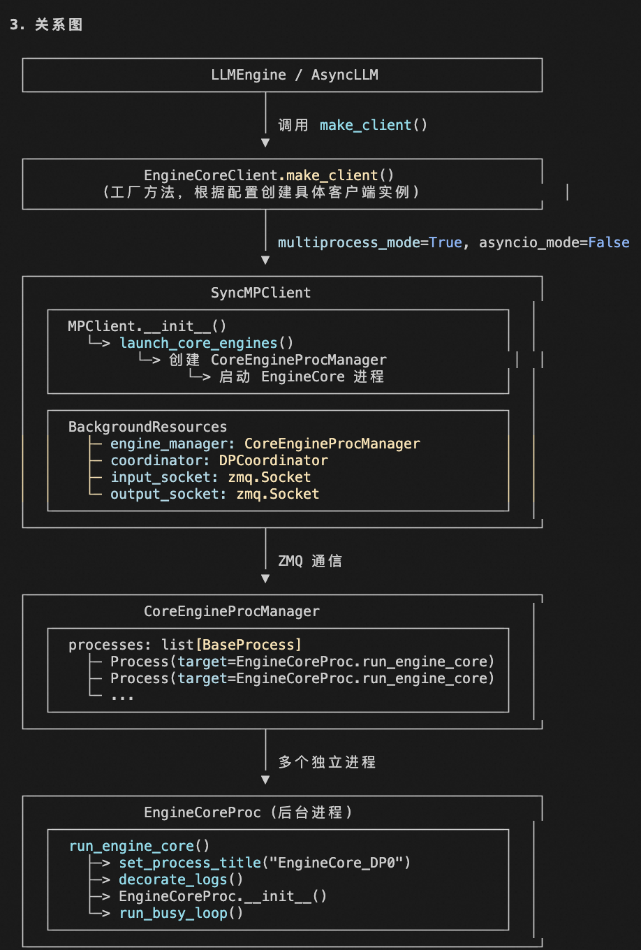 EngineCore 在独立进程中启动,通过 EngineCoreClient.make_async_mp_client() 创建 3 。