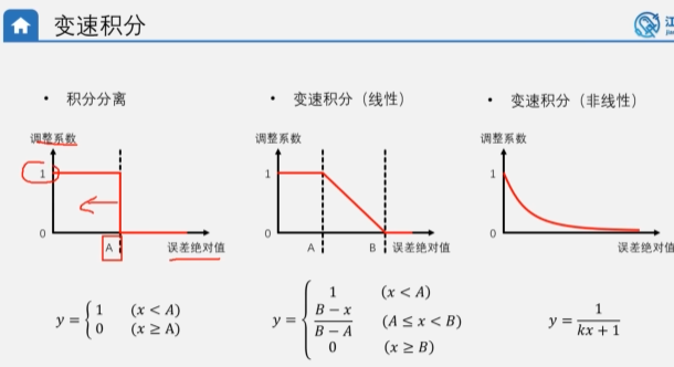 2,设计一个函数 y=1/(Kx+1),x是误差,K是调整系数(0-∞),Y是积分输出,当k=0时输出百分之百的积分效果,K等于无穷大时,y等于0表示没有积分效果,类似于一个可调的开关,随误差的增大积分的效果越不明显,反之误差越小积分效果越明显。