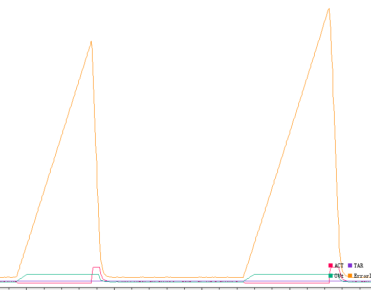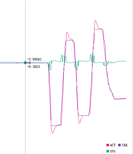 实现现象:位置停下来时,实际值与目标值的差值即是输入死区的控制值,输出值OUT为0。利用这种方法也达到了加入I项来调节的效果。