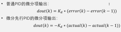 解决方式:将对误差值的微分变为对实际值的微分,微分项的输入不再是从误差求的,而是提前到从目标值与实际值差值,这就是微分先行。公式中为什么要加入负号?对实际值的微分即求斜率求出来的值是正值,我们需要的是反向的斜率。
