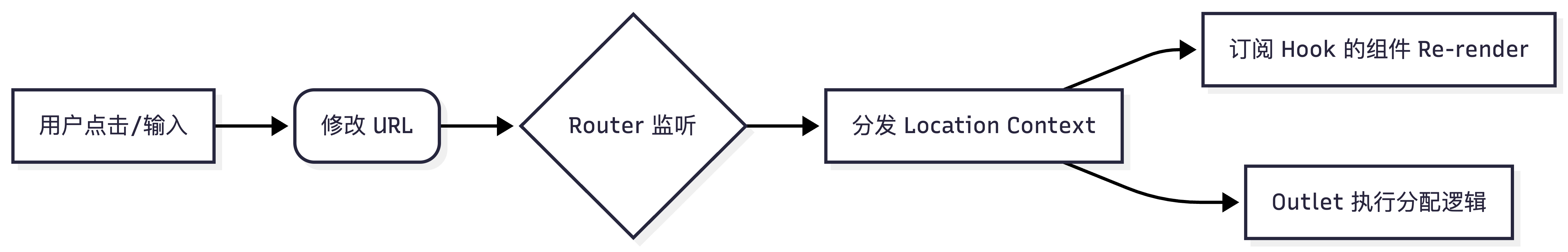 RouterProvider监听到路径变化,其内部维护的路由 Context 发生更新。 - 通知订阅者 :所有调用了路由 Hooks(如