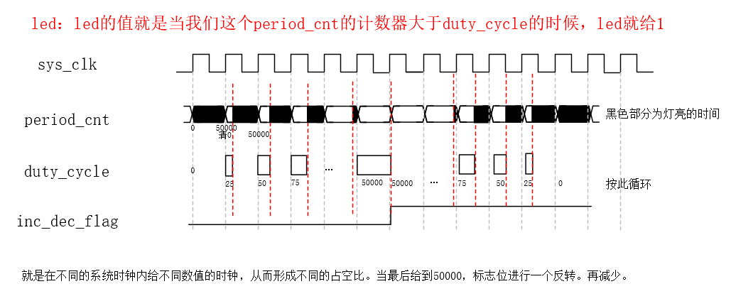 //第一个空占25,第二个空占50,第三个空占75,不断累加,占空比越占越宽,当占到50000之后占满了,再开始减小,再25、25的减再减到0,这样就实现了一个pwm波的产生。