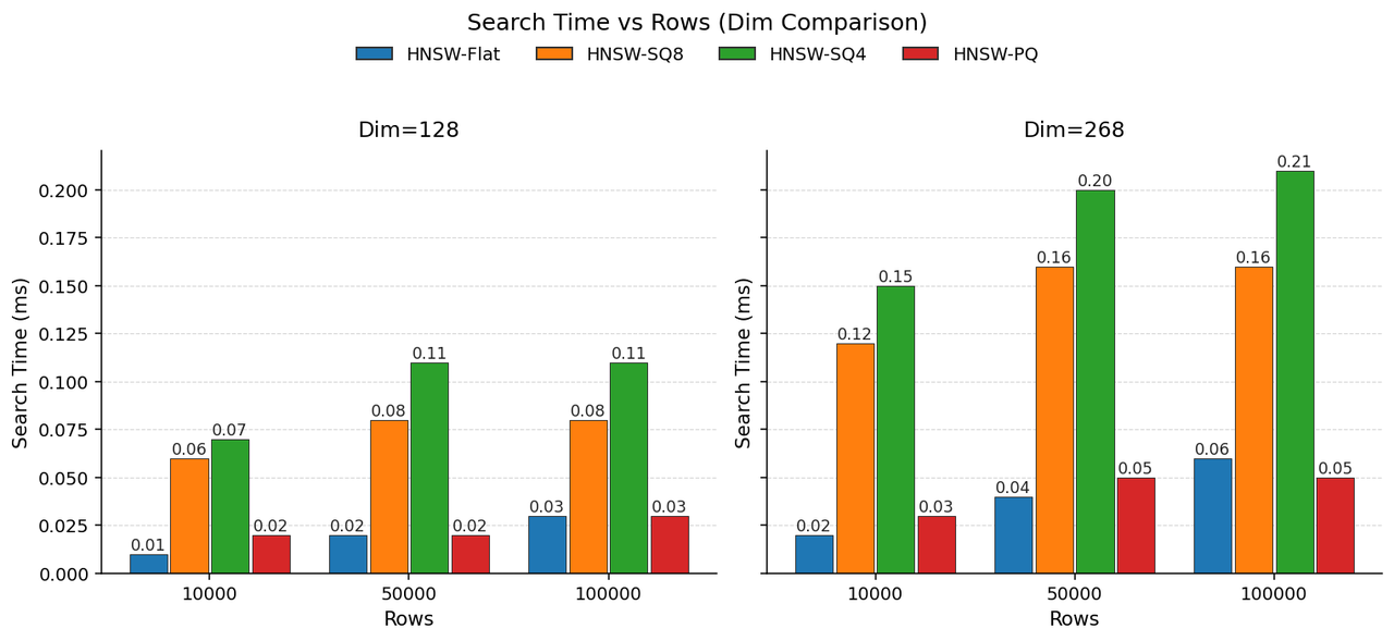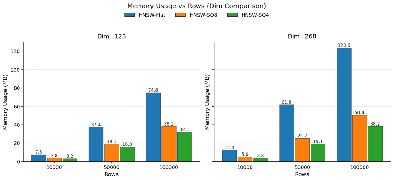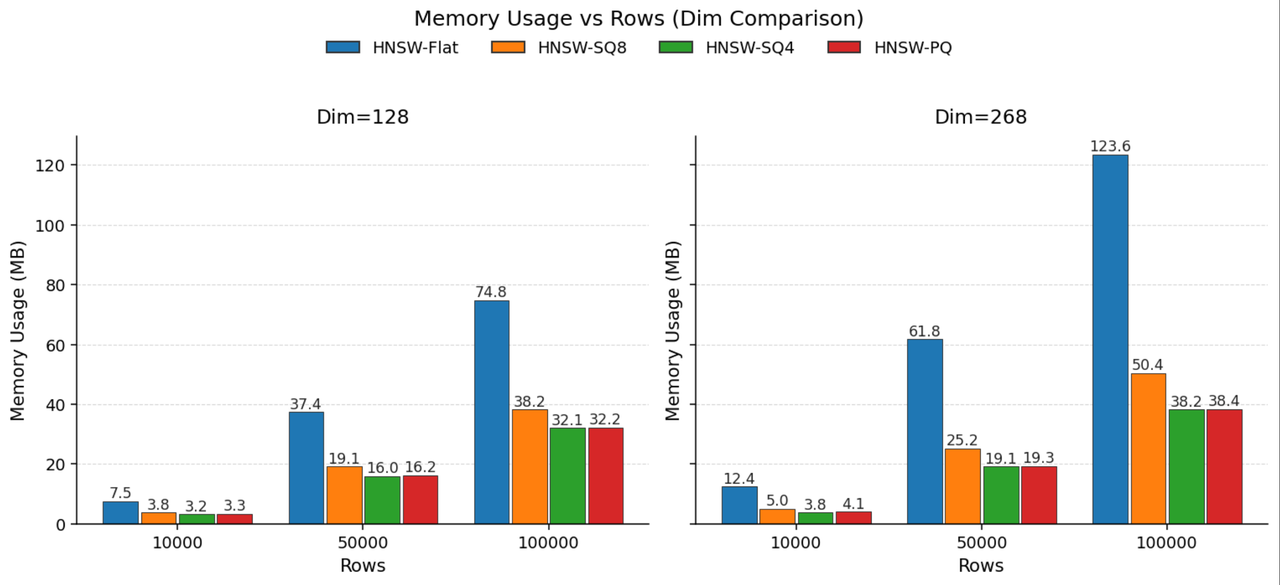 上图展示了在 128 维和 268 维向量上的测试结果。相比 FLAT(不编码,用完整 Float32 表示每个浮点数),SQ8 可实现接近 2.5 倍的压缩,而 SQ4 可实现接近 3.3 倍的压缩。
