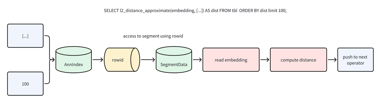 以 SELECT id, l2_distance_approximate(embedding, [...]) AS dist FROM tbl ORDER BY dist LIMIT 100;为例: