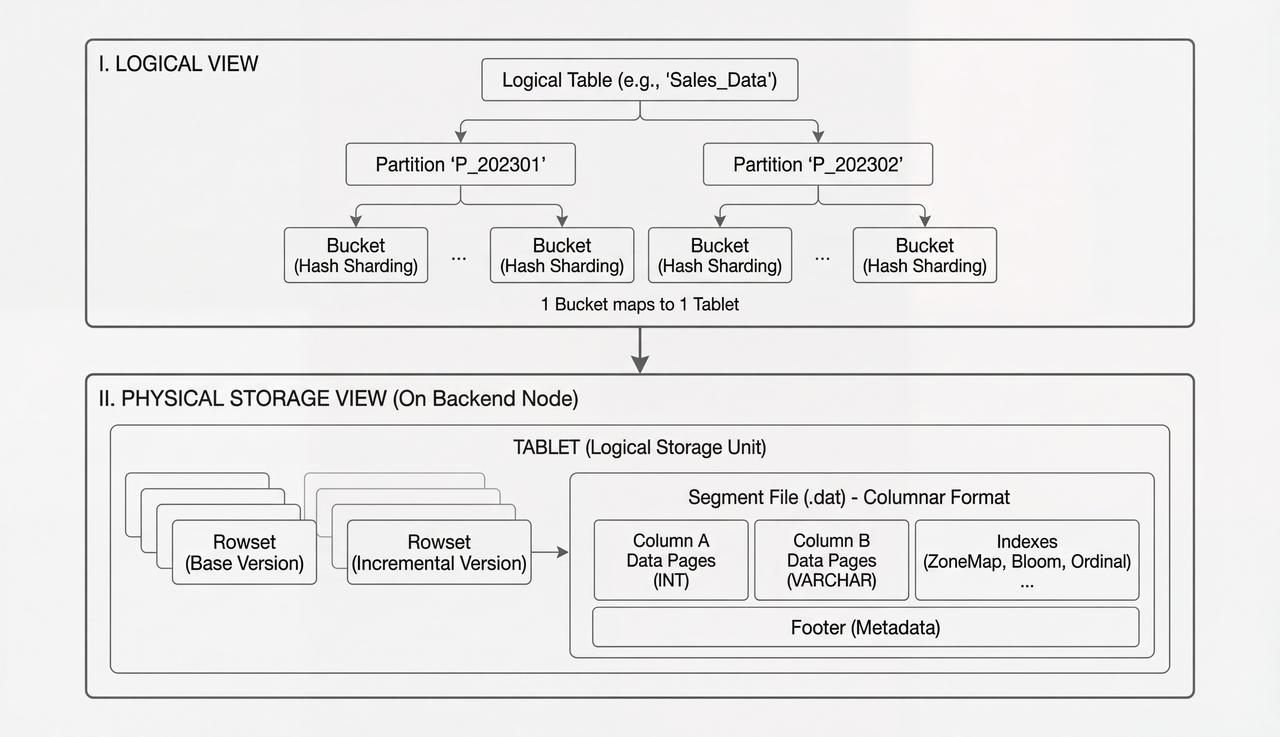 Apache Doris 将逻辑表在内核层拆分为多个 Tablet。每次数据导入会生成一个 Rowset,每个 Rowset 又包含若干 Segment,而 ANN 索引正是在 Segment 粒度上构建与使用的。这一设计将 "全表数据量" 与 "索引超参数" 解耦,用户只需根据单批次导入的数据规模来设定参数,无需因数据总量增加而反复重建索引。