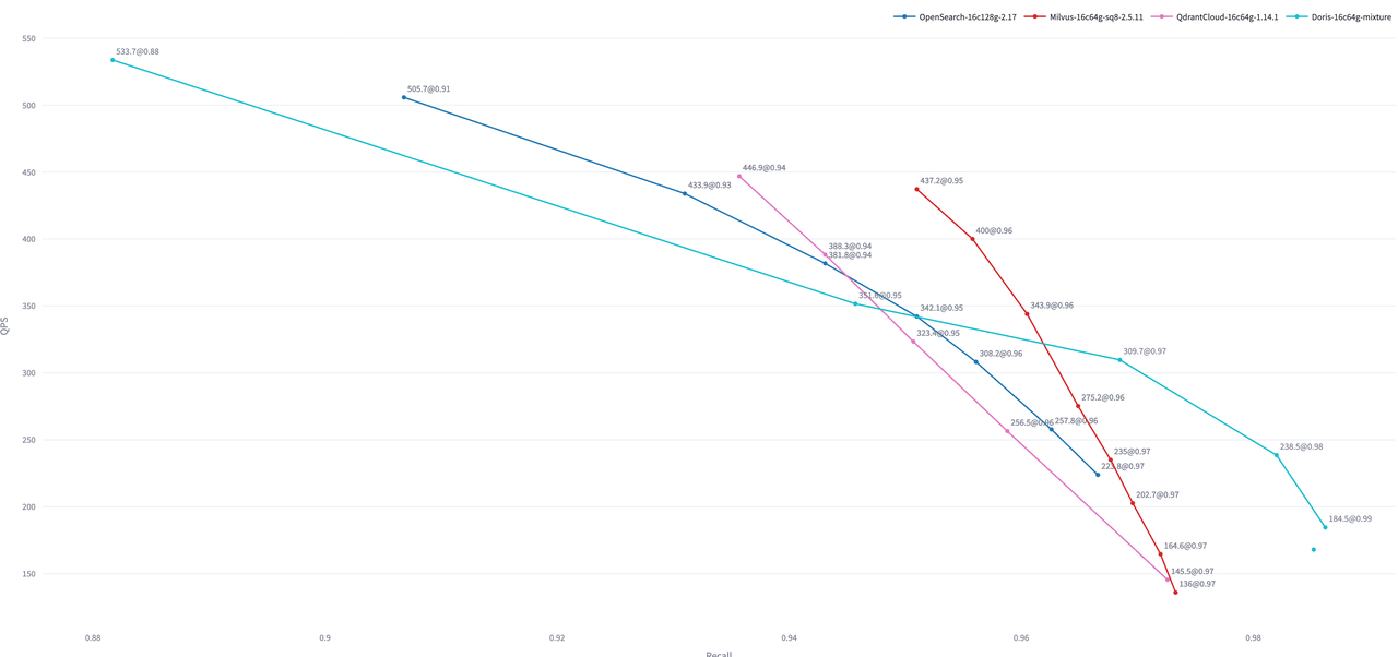 在 Performance768D10M 数据规模上,当召回率要求高于 95% 时,Apache Doris 的 QPS 表现优于 OpenSearch 与 Qdrant 。此结果为默认配置下的开箱性能,未针对 Segment 文件数量等进行专项调优。
