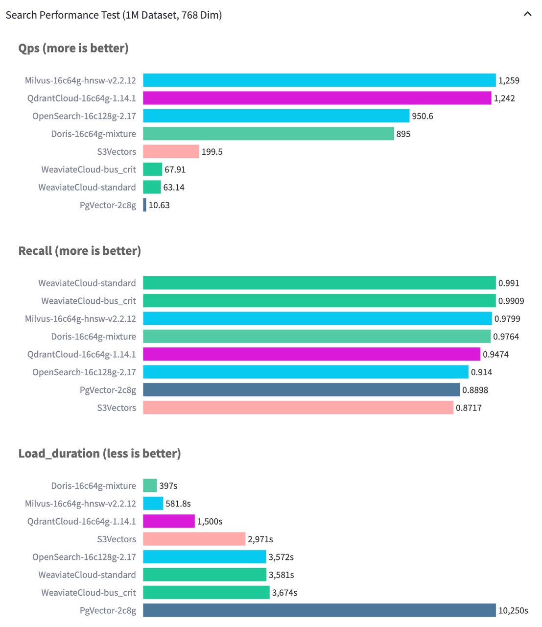Apache Doris 的目标并非追求单一指标的极限表现,而是在真实生产负载下,实现性能的均衡性、系统稳定性与架构可扩展性 。本次测试将围绕这一目标展开,所用工具为 ZillizTech 开源的向量搜索 BenchMark:https://github.com/zilliztech/VectorDBBench。