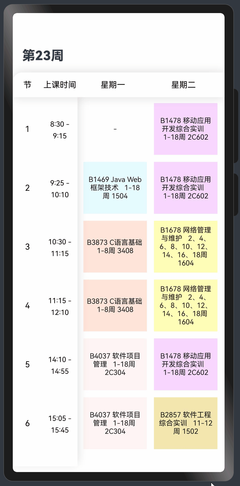 new Course('B1478 移动应用开发综合实训 1-18周 2C602', '#EDC7FF'),