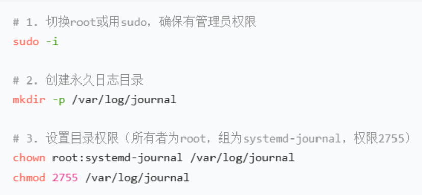 <4>日志会持久化到****/var/log/journal****,重启后也能保留。(没有文件则手动创建,并配置正确的权限