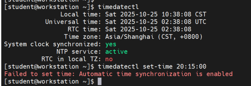 系统启用了自动时间同步(NTP),因此无法手动设置时间(自动同步会覆盖手动设置的时间)。