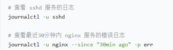 -u <单元名>:查看指定服务(如 sshd、nginx)或系统单元的日志。