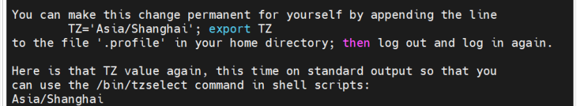 完成上述选择后,出现对 tzselect 时区选择结果的永久生效配置说明(下图):