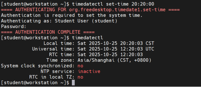 再次设置时间:timedatectl set-time 20:20:00,完成后查看(timedatectl),发现成功(Local time)