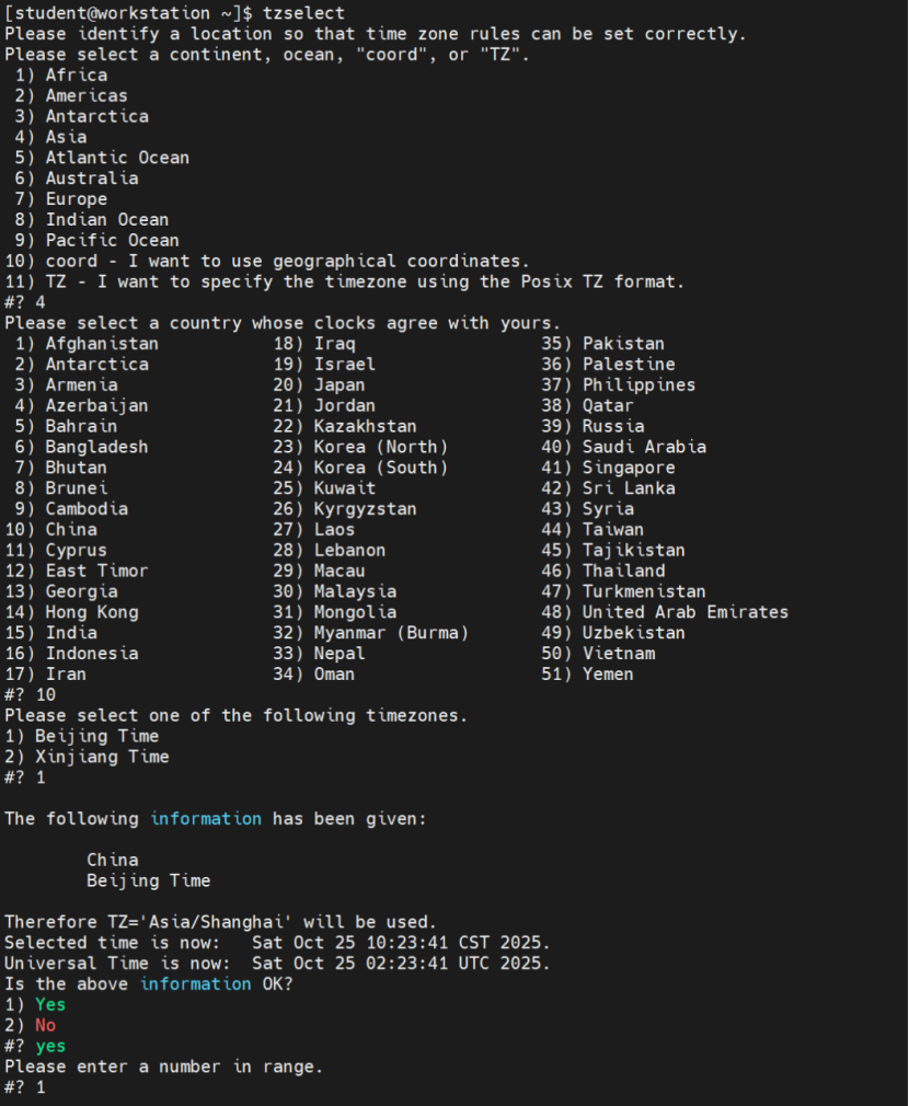 | 确认配置 | 系统提示将使用TZ='Asia/Shanghai',并展示本地时间和 UTC 时间;输入1(对应 Yes)确认 | Asia/Shanghai是 Linux 系统中 "北京时间" 的标准时区标识,确认后完成选择 |