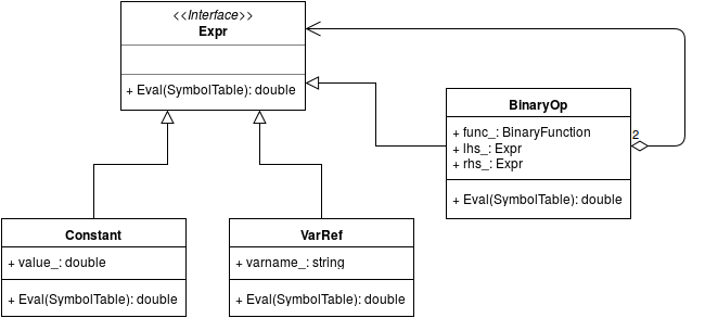 Imagine we're designing a simple expression evaluator. Following the standard interpreter design pattern, we have a tree structure consisting of expressions, with some operations we can do on such trees. In C++ we'd have an interface every node in the expression tree would have to implement: