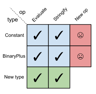 On the other hand, if we want to add a new type (like "function call"), we get into trouble. We now have to modify all existing functions to handle this new type. So we hit exactly the same problem, albeit from a different angle.