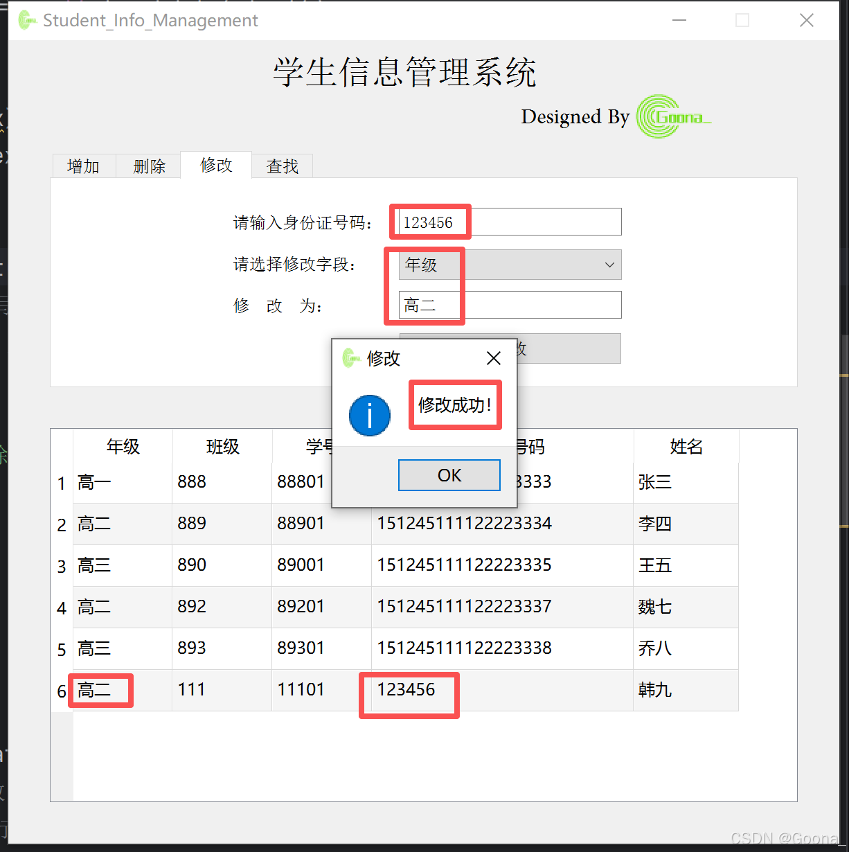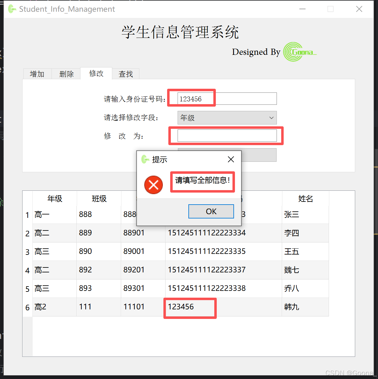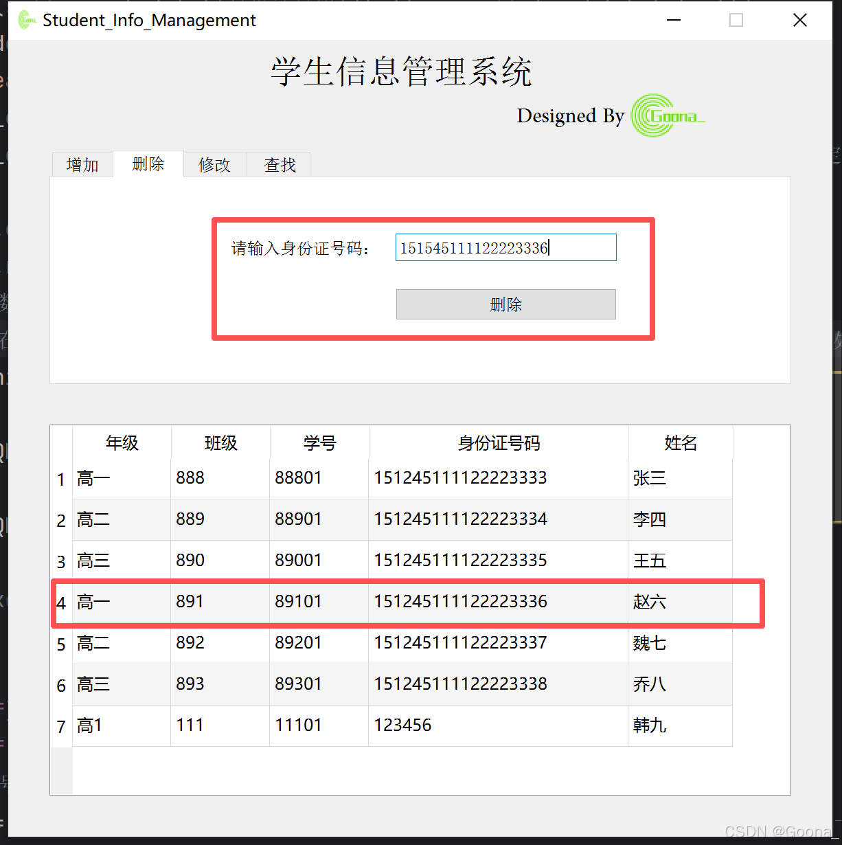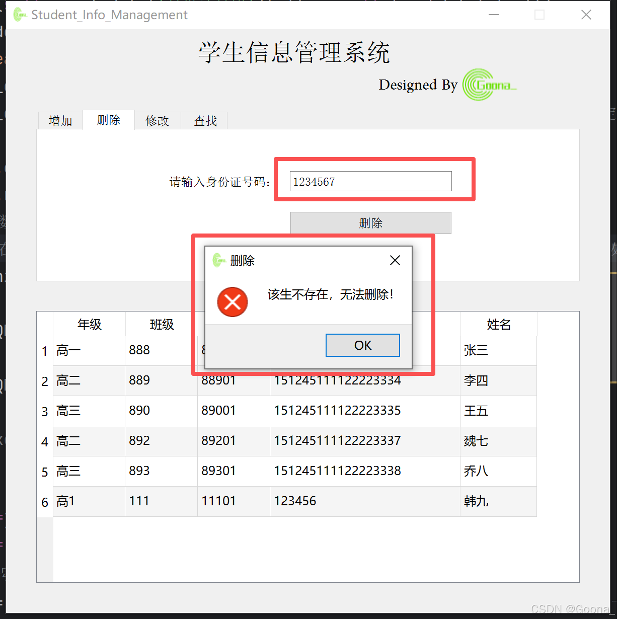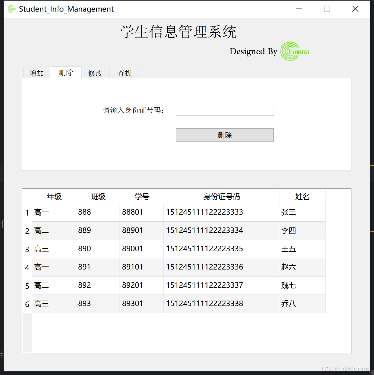 删除指定学生信息,仅需要该生的身份证号码即可。点击"删除"后,自行将数据库中该生的全部信息删除,若下方还有学生,则依次向上递补,同时显示"删除成功"。若该生不存在,点击"删除"后,则无法删除。