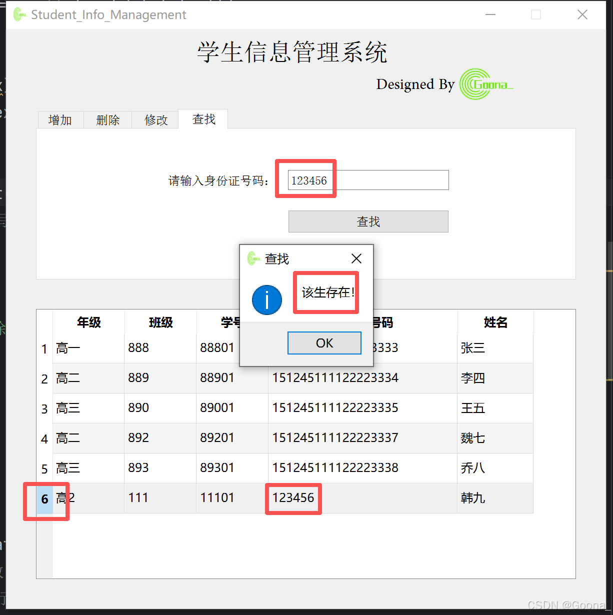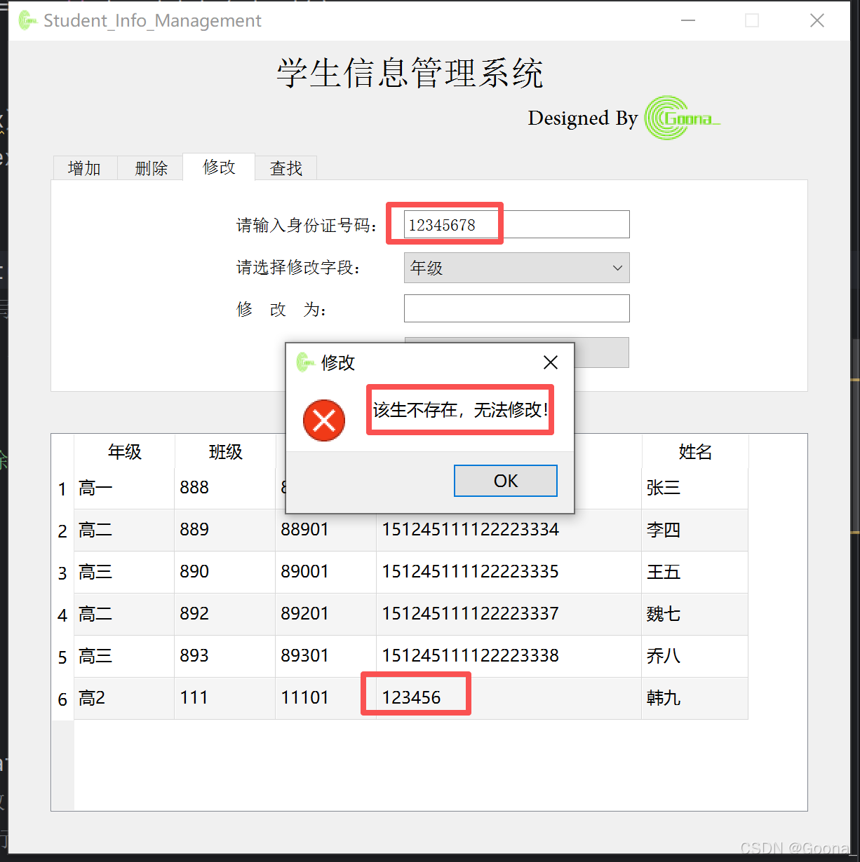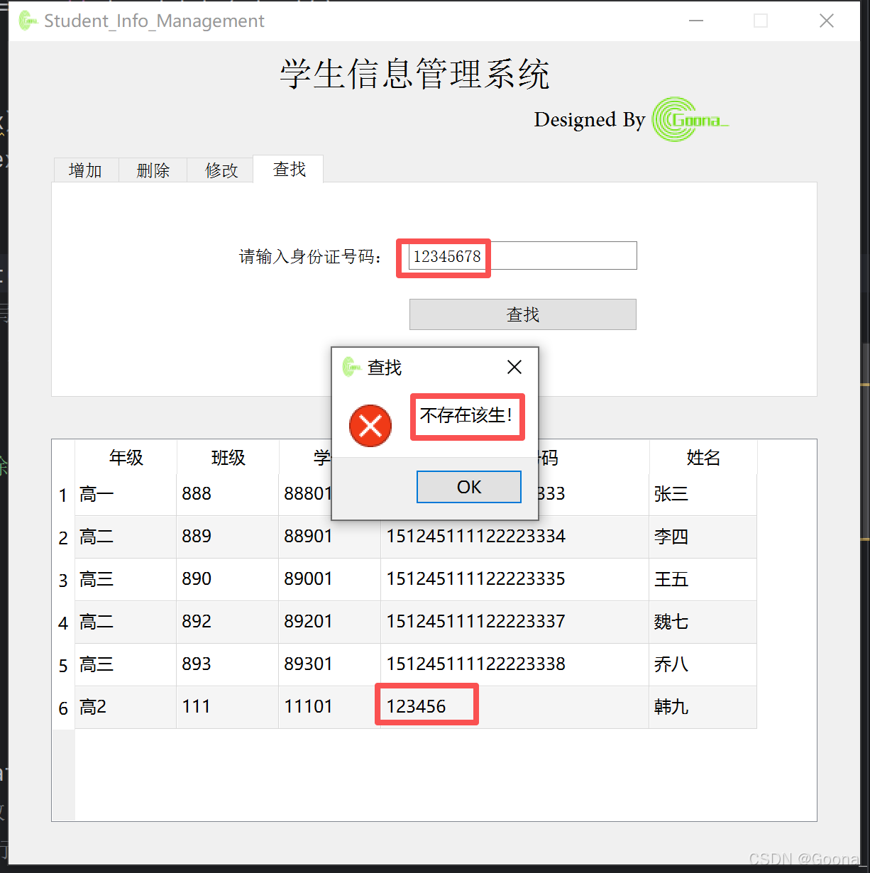 首先,同样通过输入身份证号码来判断学生是否存在,若不存在,提示"不存在该生";若存在,则直接在下方表格中用蓝色定位到该生的整行所有信息。