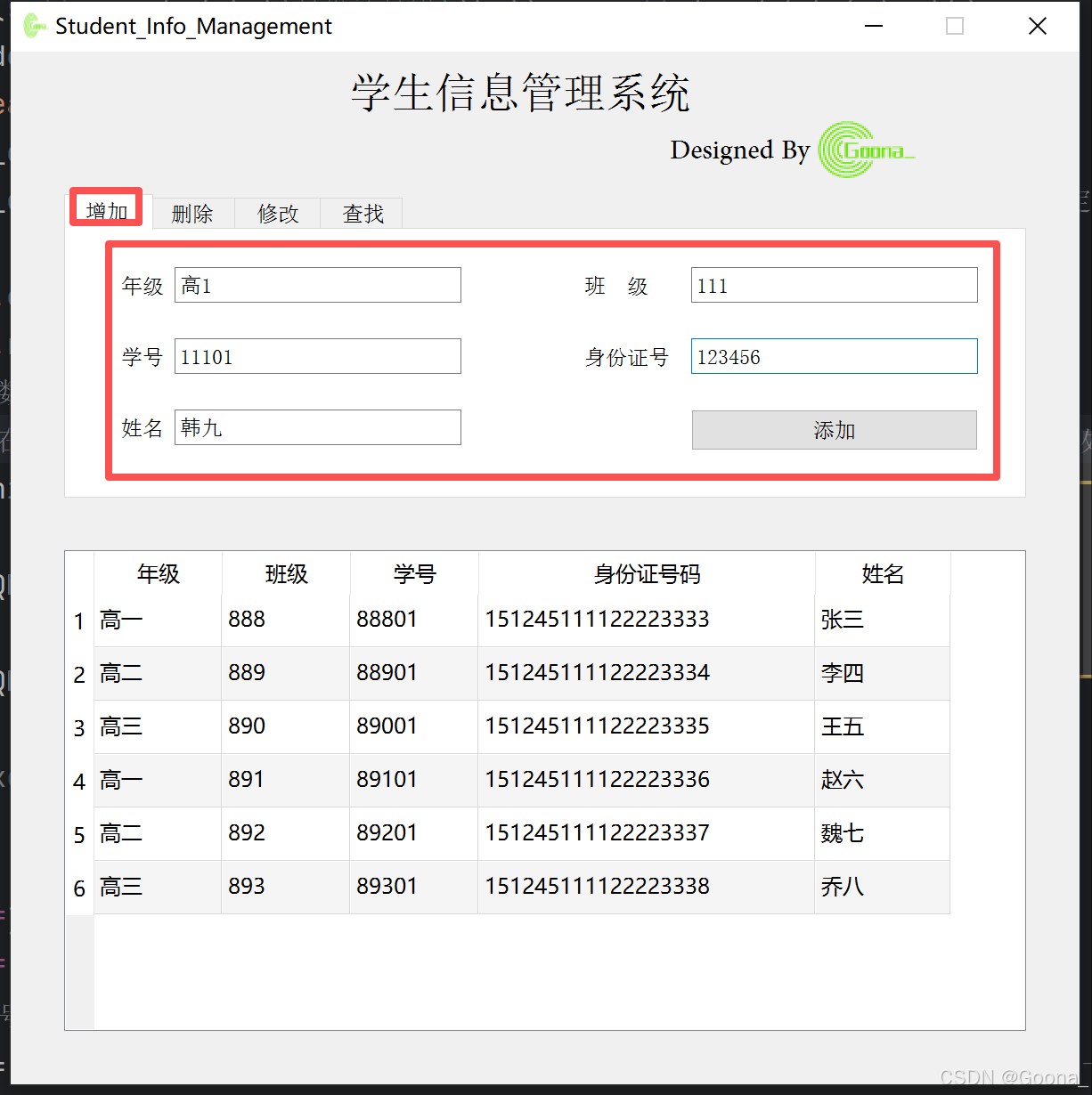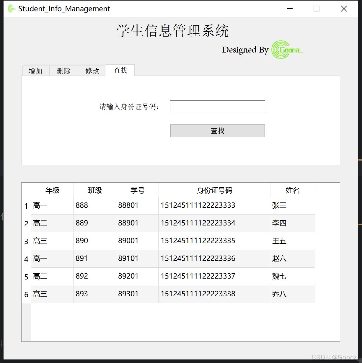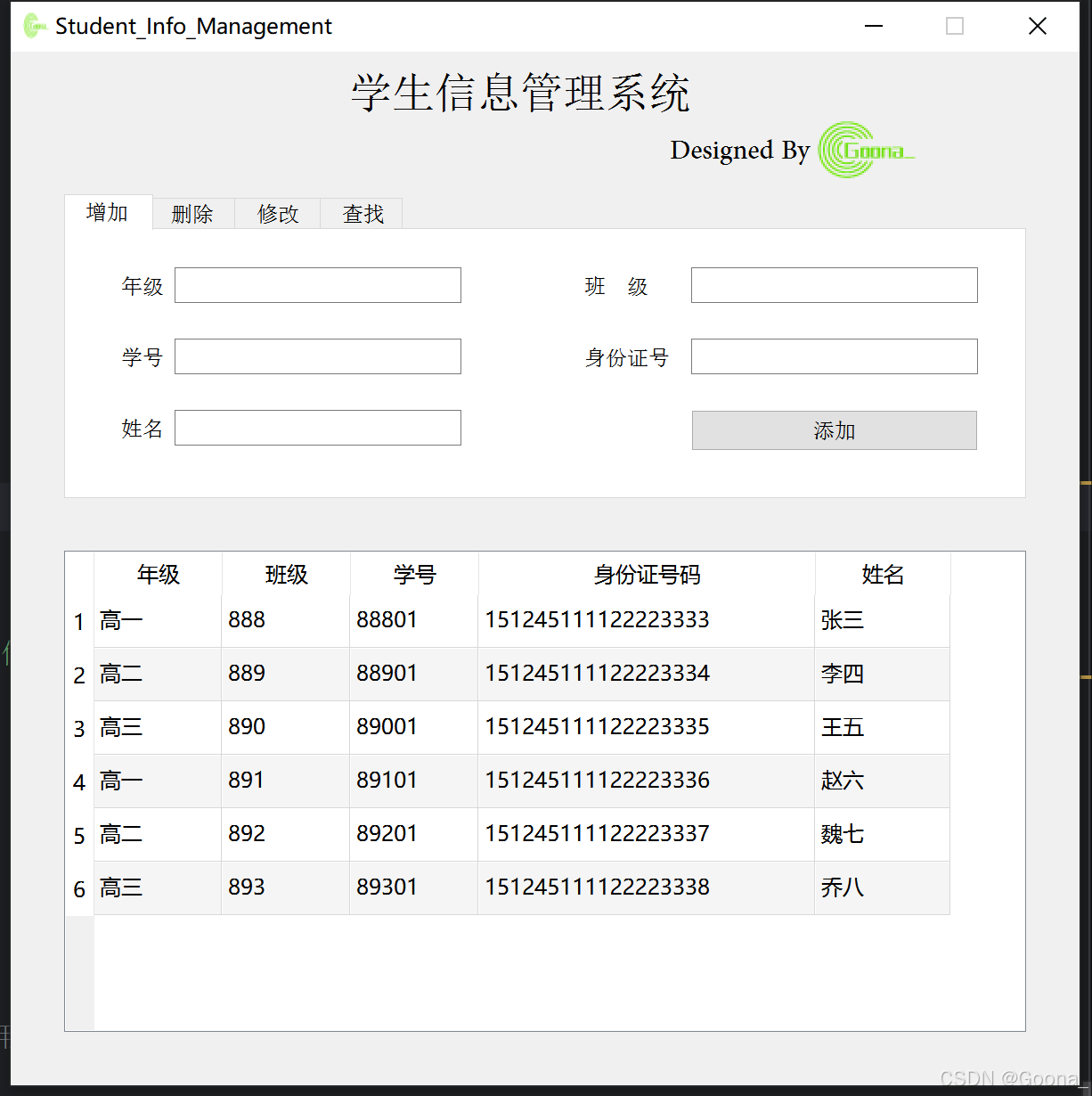 使用PyQt5进行界面的搭建,最终的增、删、改、查界面如下:
