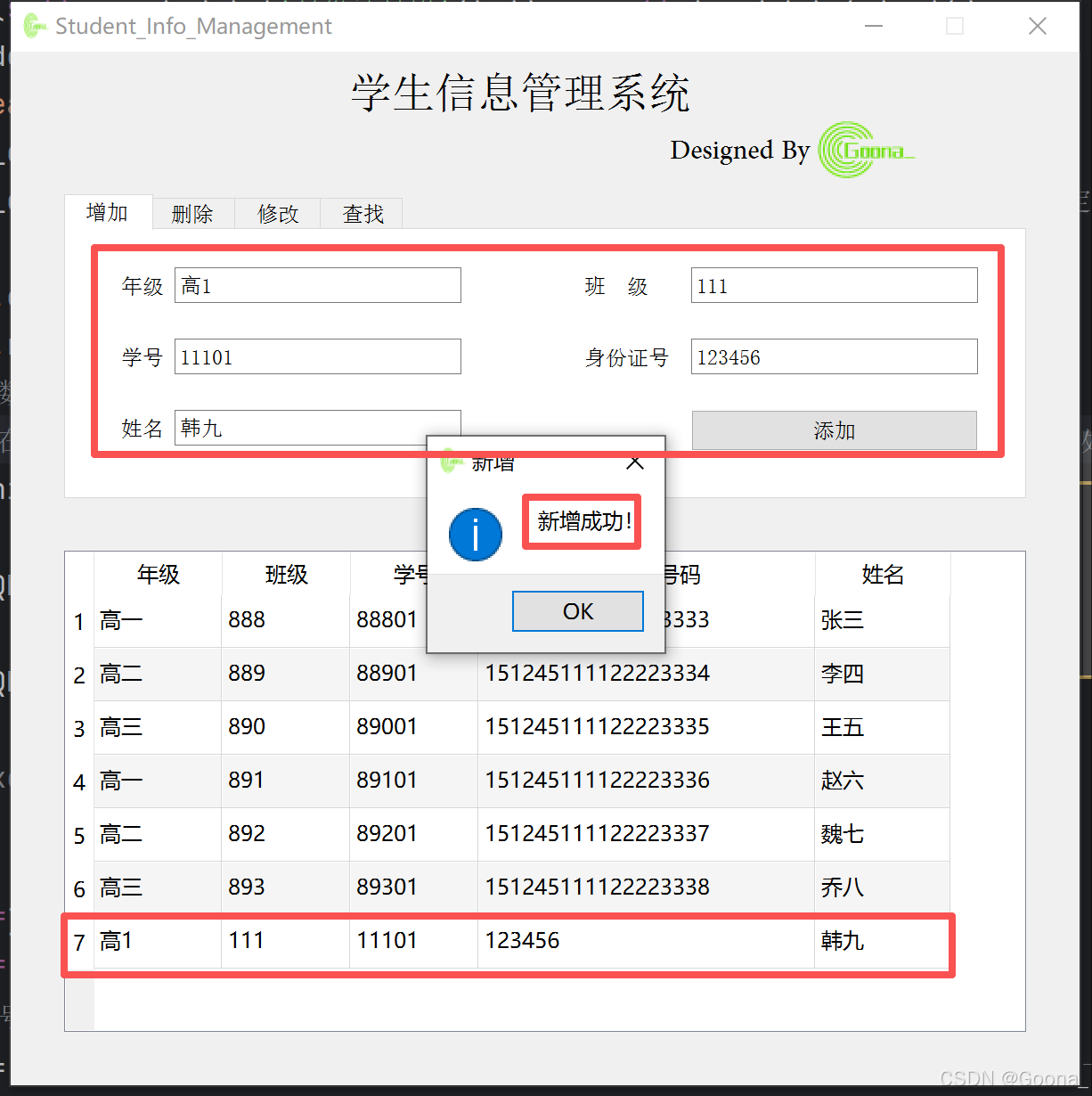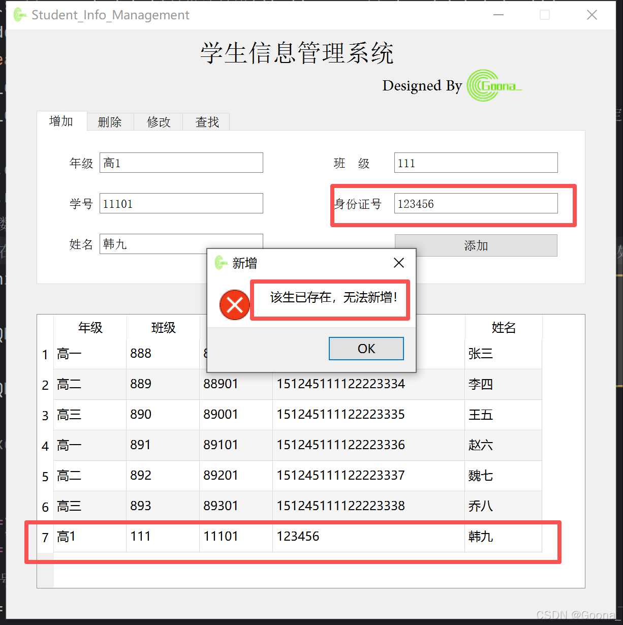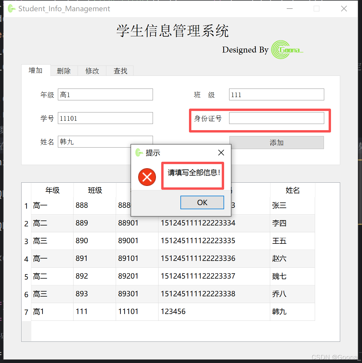 依次填写"年级"、"班级"、"学号"、"身份证号"、"姓名"信息后,点击"添加",新增信息默认添加至表格的末尾。需要注意的是,这五项信息缺一不可,均为必填字段 ,若有一项是空白,则会弹出提示"请填写全部信息!",直至满足条件后,才会添加成功(这里并未对每个输入框信息格式做特别要求,均按照字符串进行处理,若有需求,可自行添加正则表达式规定特定输入格式)。此外,若添加的学生在表格中已经存在(根据身份证号码进行判断),则会弹出"该生已存在,无法新增"的提示。