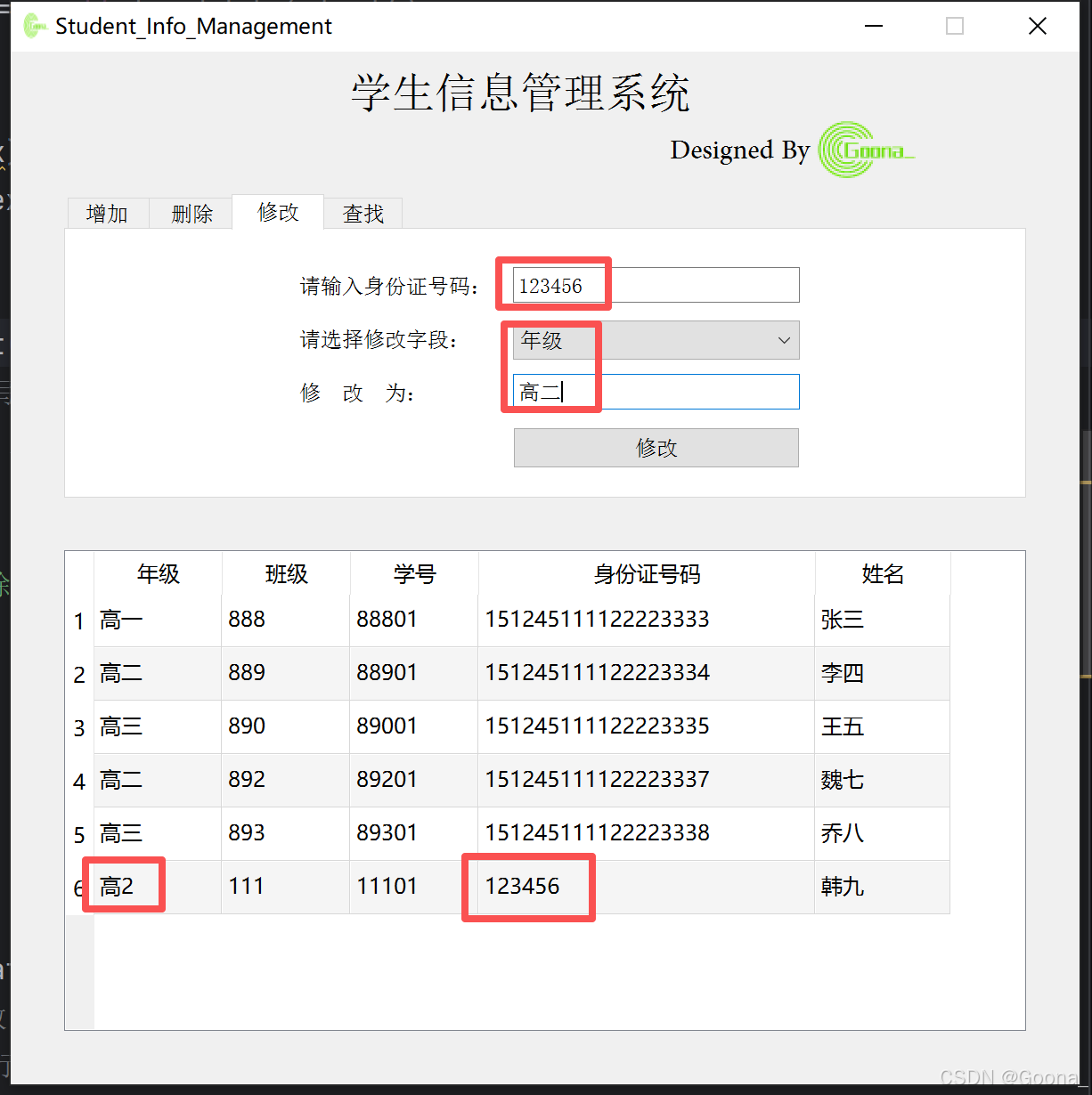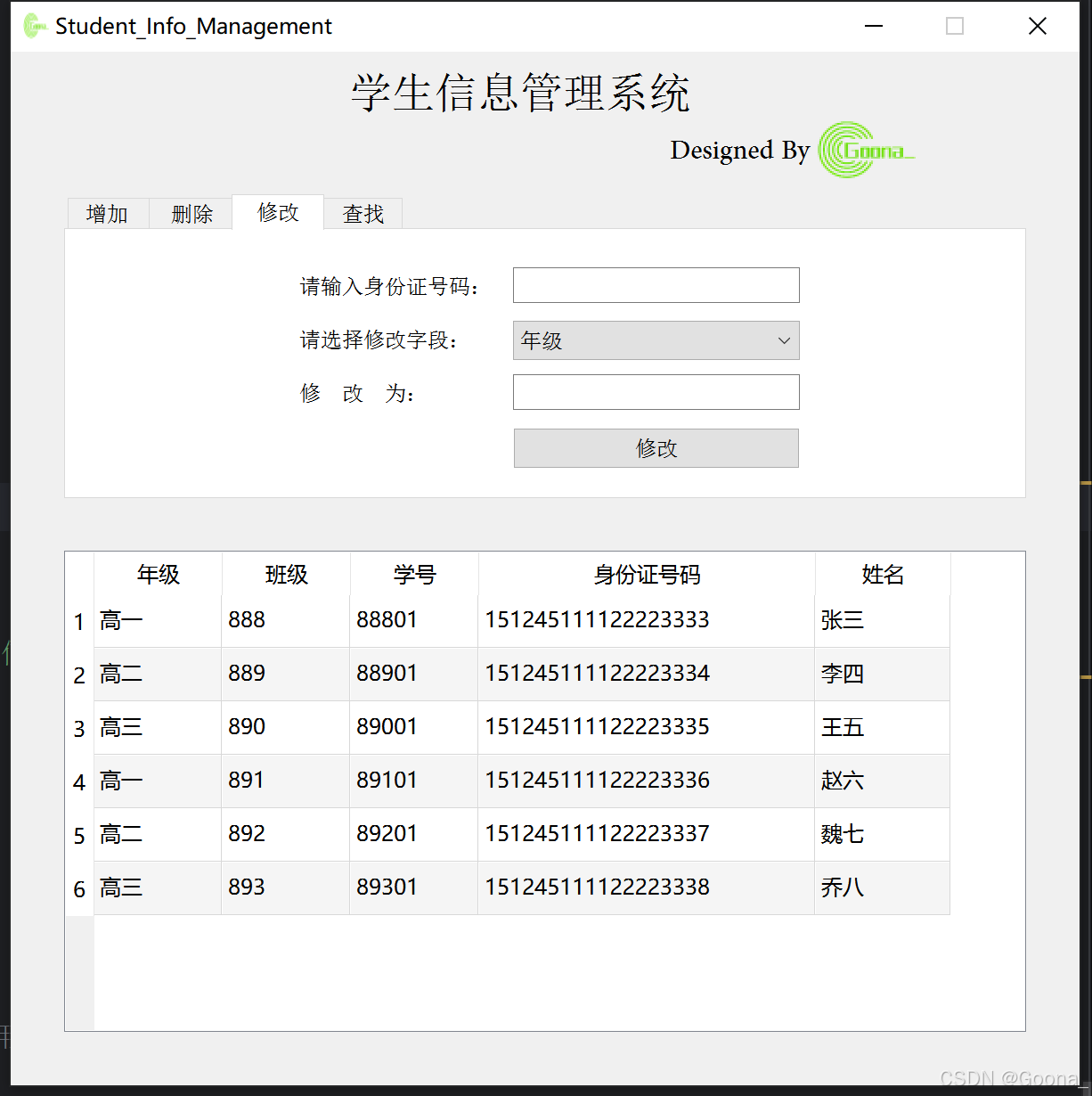 通过身份证号在chazhao函数中判断学生是否在表中,不在表中的无法修改;获取用户选择的combobox字段索引(也即excel_data中的列索引),再加上通过遍历得到的行索引将用户修改内容modify_content写入对应位置。最后xieru和xianshi。