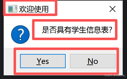 在程序运行的初始阶段,除对用户表示欢迎之外,更为重要的是需要询问信息管理者是否具有"学生信息表";如果用户选择"Yes",则弹出"请选择文件"界面,选择相应且满足格式的文件并上传后,会弹出"上传成功"的提示;如果用户选择"No",则会自动下载Excel文件"学生信息表模板"至当前目录下。