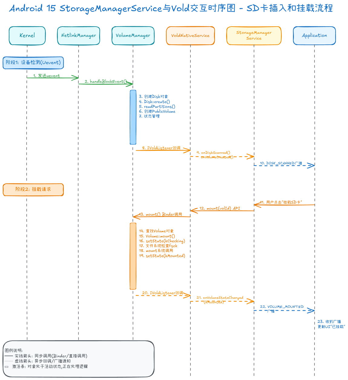 本文将基于Android 15 (AOSP 15.0) 的源码,深入剖析Vold的架构设计、启动流程、核心组件以及与StorageManagerService的交互机制。